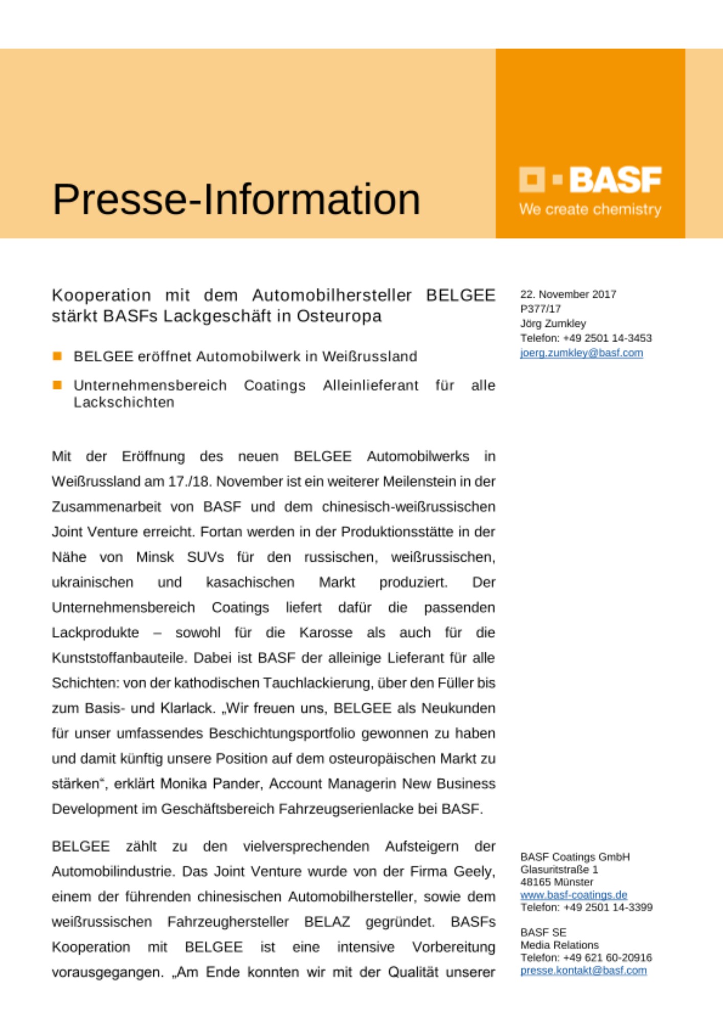 Mit der Eröffnung des neuen BELGEE Automobilwerks in Weißrussland am 17./18. November ist ein weiterer Meilenstein in der Zusammenarbeit von BASF und dem chinesisch-weißrussischen Joint Venture erreicht. Fortan werden in der Produktionsstätte in der Nähe von Minsk SUVs für den russischen, weißrussischen, ukrainischen und kasachischen Markt produziert. Der Unternehmensbereich Coatings liefert dafür die passenden Lackprodukte – sowohl für die Karosse als auch für die Kunststoffanbauteile. Dabei ist BASF der alleinige Lieferant für alle Schichten: von der kathodischen Tauchlackierung, über den Füller bis zum Basis- und Klarlack. „Wir freuen uns, BELGEE als Neukunden für unser umfassendes Beschichtungsportfolio gewonnen zu haben und damit künftig unsere Position auf dem osteuropäischen Markt zu stärken“, erklärt Monika Pander, Account Managerin New Business Development im Geschäftsbereich Fahrzeugserienlacke bei BASF.