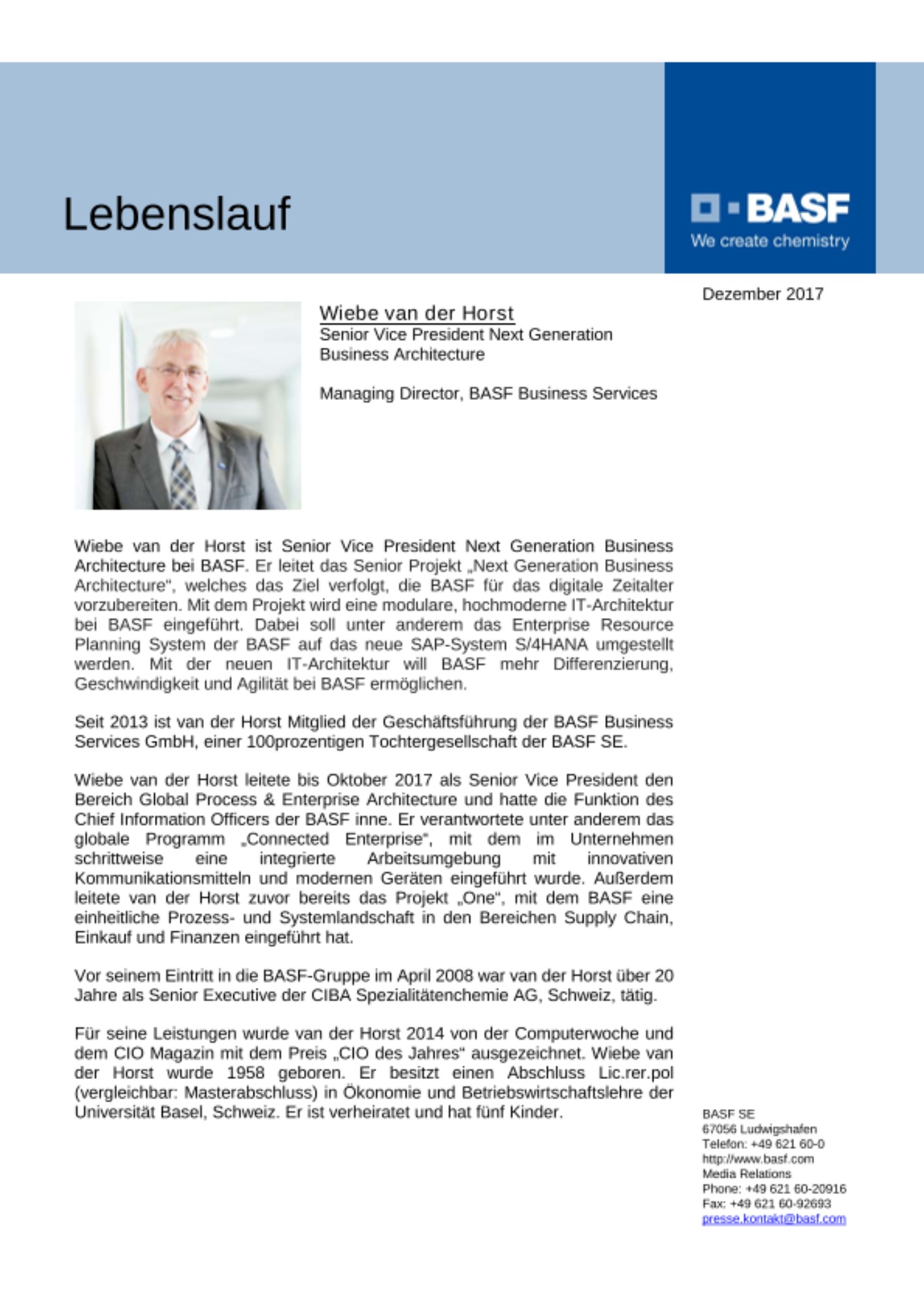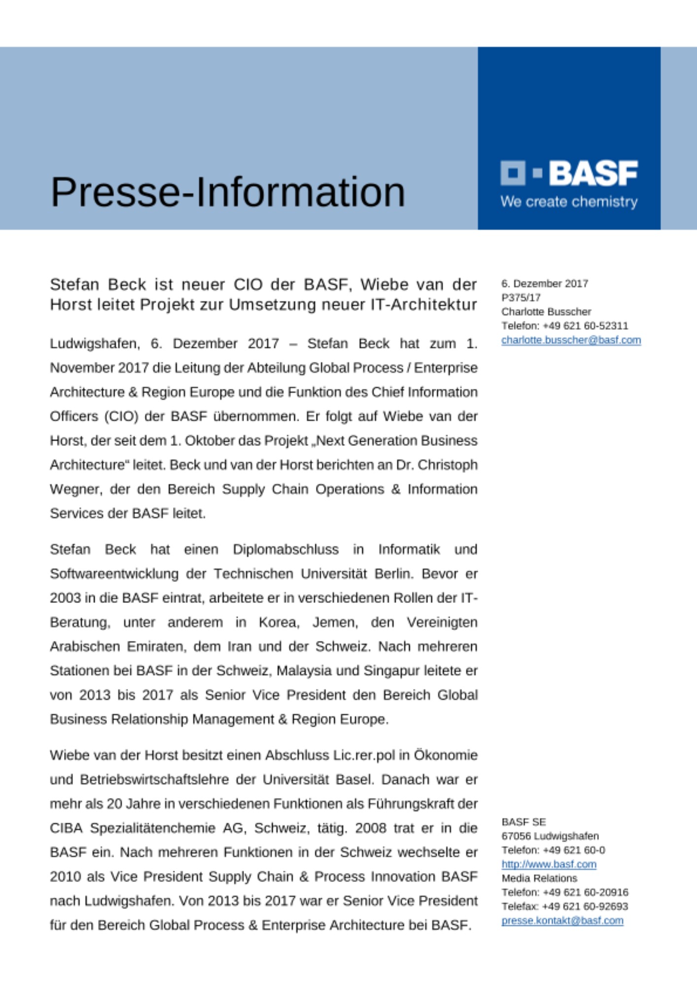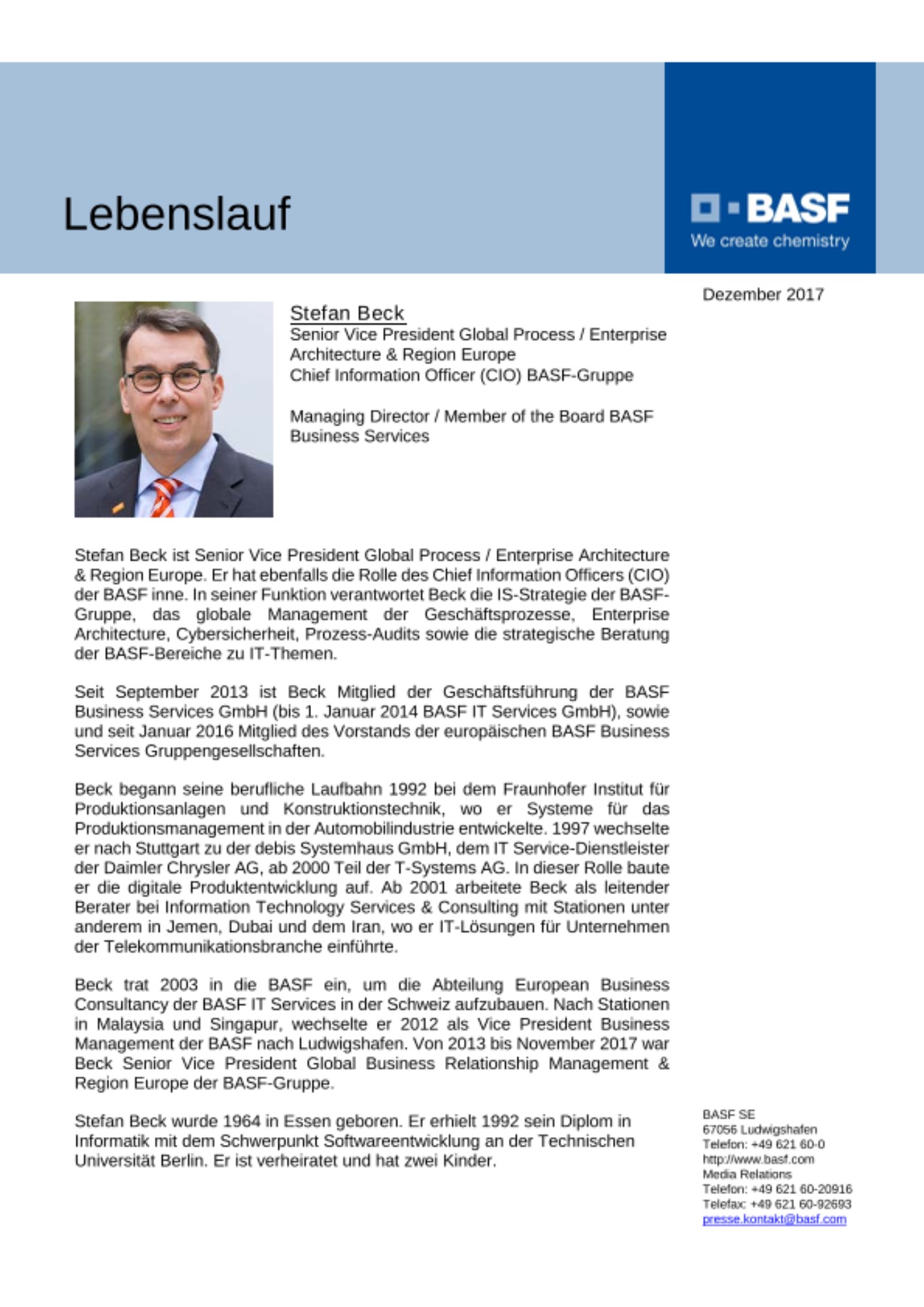 Ludwigshafen, 6. Dezember 2017 – Stefan Beck hat zum 1. November 2017 die Leitung der Abteilung Global Process / Enterprise Architecture & Region Europe und die Funktion des Chief Information Officers (CIO) der BASF übernommen. Er folgt auf Wiebe van der Horst, der seit dem 1. Oktober das Projekt „Next Generation Business Architecture“ leitet. Beck und van der Horst berichten an Dr. Christoph Wegner, der den Bereich Supply Chain Operations & Information Services der BASF leitet.