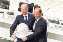 Mit Ablauf der Hauptversammlung 2018 wird Dr. Martin Brudermüller neuer Vorstandsvorsitzender der BASF SE. Auf der Hauptversammlung übergab der bisherige Vorstandsvorsitzende Dr. Kurt Bock seinem Nachfolger ein 3D-gedrucktes Modell einer symbolkräftigen Szene aus dem BASF-Stammsitz in Ludwigshafen. Brudermüller ist seit 2006 Mitglied des Vorstands der BASF SE, seit 2011 stellvertretender Vorstandsvorsitzender sowie seit 2015 Chief Technology Officer.