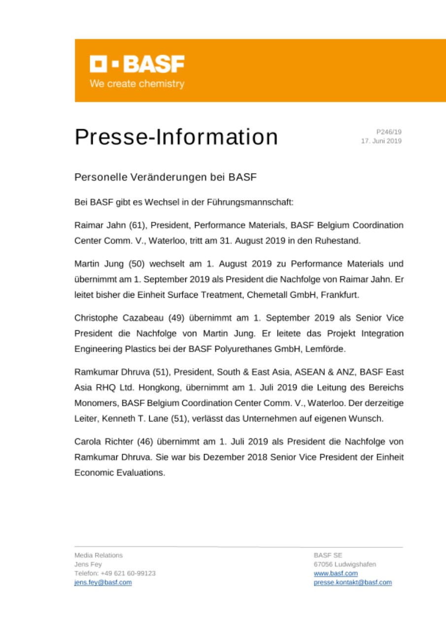 Raimar Jahn (61), President, Performance Materials, BASF Belgium Coordination Center Comm. V., Waterloo, tritt am 31. August 2019 in den Ruhestand.