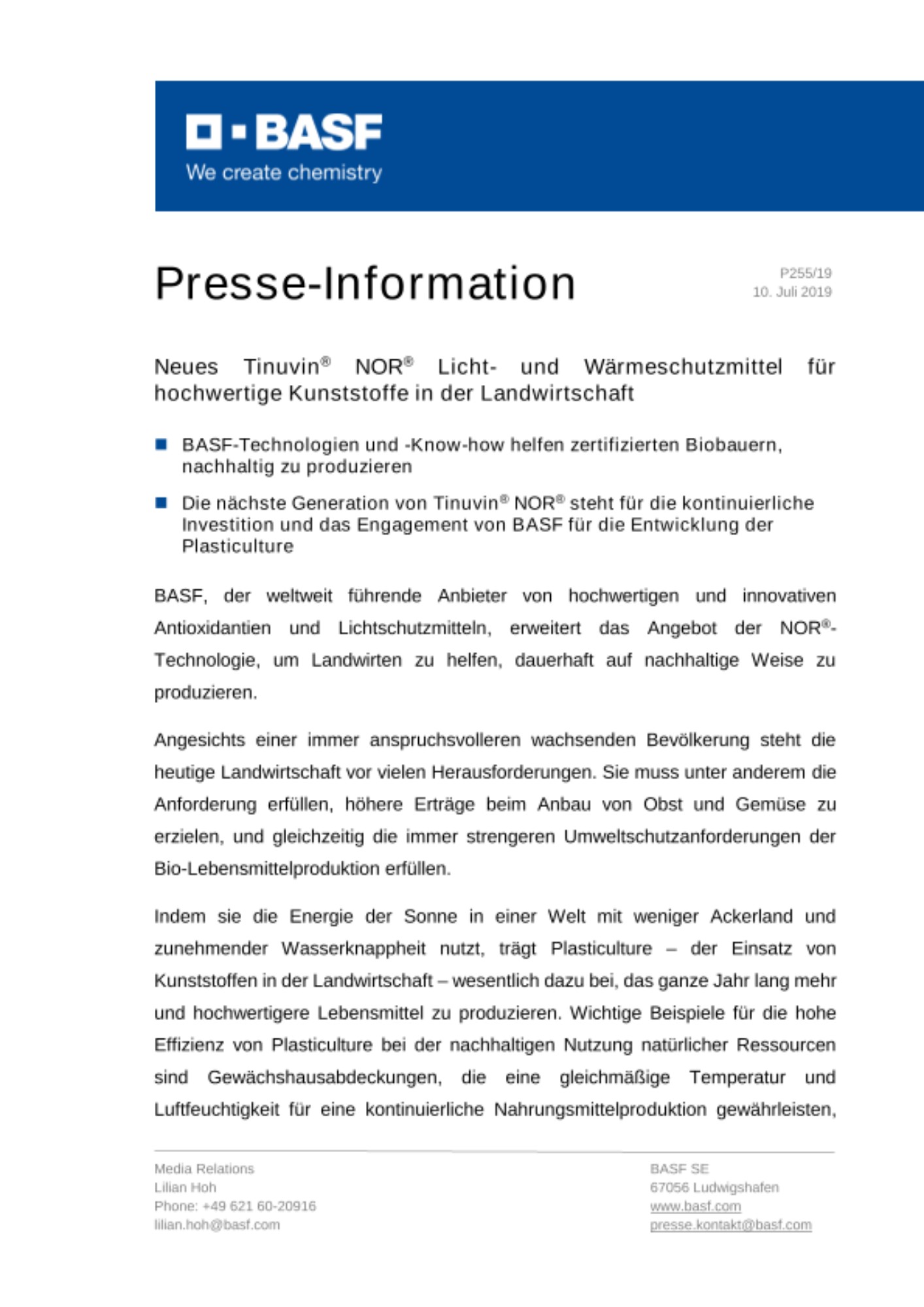 BASF, der weltweit führende Anbieter von hochwertigen und innovativen Antioxidantien und Lichtschutzmitteln, erweitert das Angebot der NOR®-Technologie, um Landwirten zu helfen, dauerhaft auf nachhaltige Weise zu produzieren.