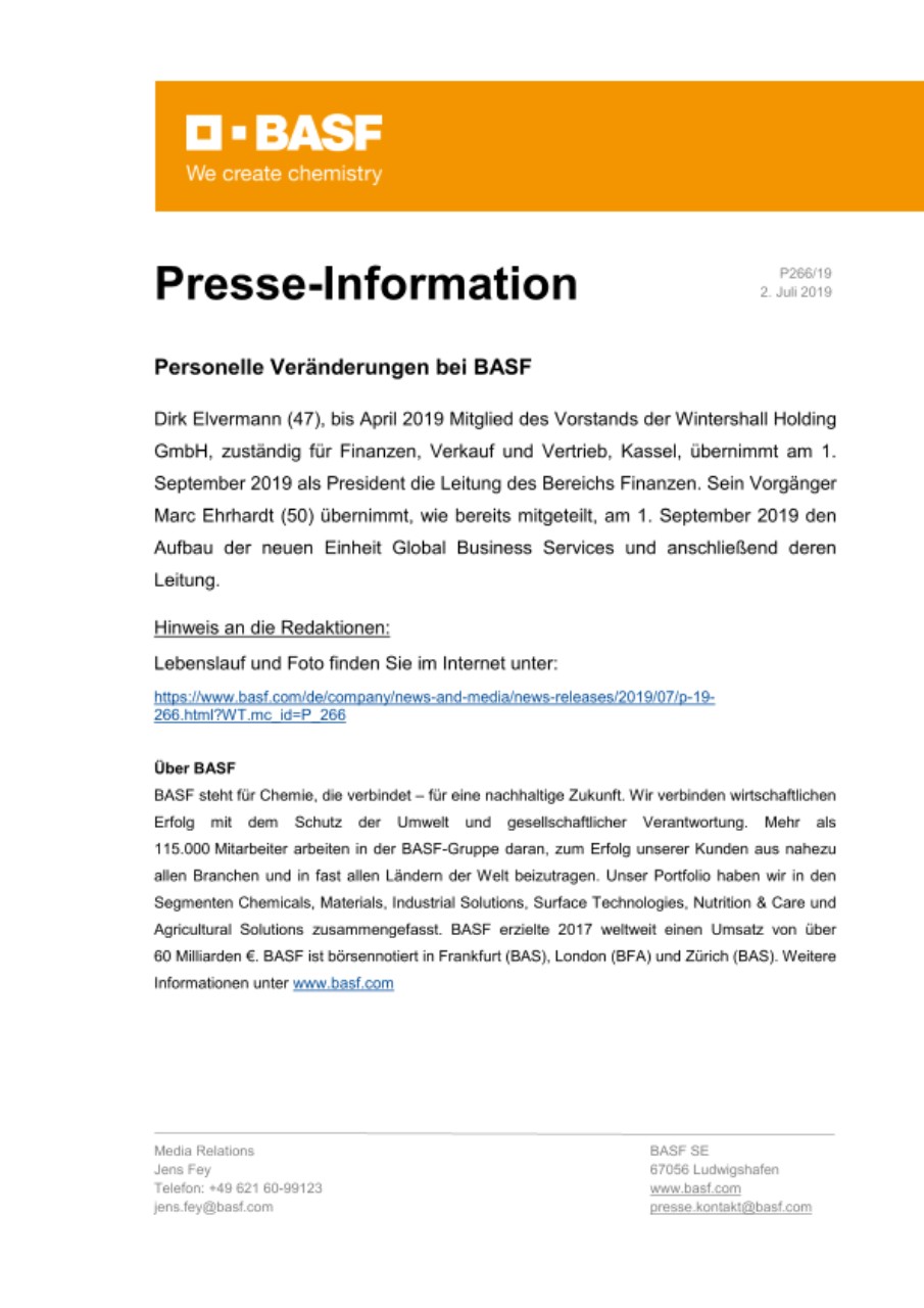 Dirk Elvermann (47), bis April 2019 Mitglied des Vorstands der Wintershall Holding GmbH, zuständig für Finanzen, Verkauf und Vertrieb, Kassel, übernimmt am 1. September 2019 als President die Leitung des Bereichs Finanzen. Sein Vorgänger Marc Ehrhardt (50) übernimmt, wie bereits mitgeteilt, am 1. September 2019 den Aufbau der neuen Einheit Global Business Services und anschließend deren Leitung.