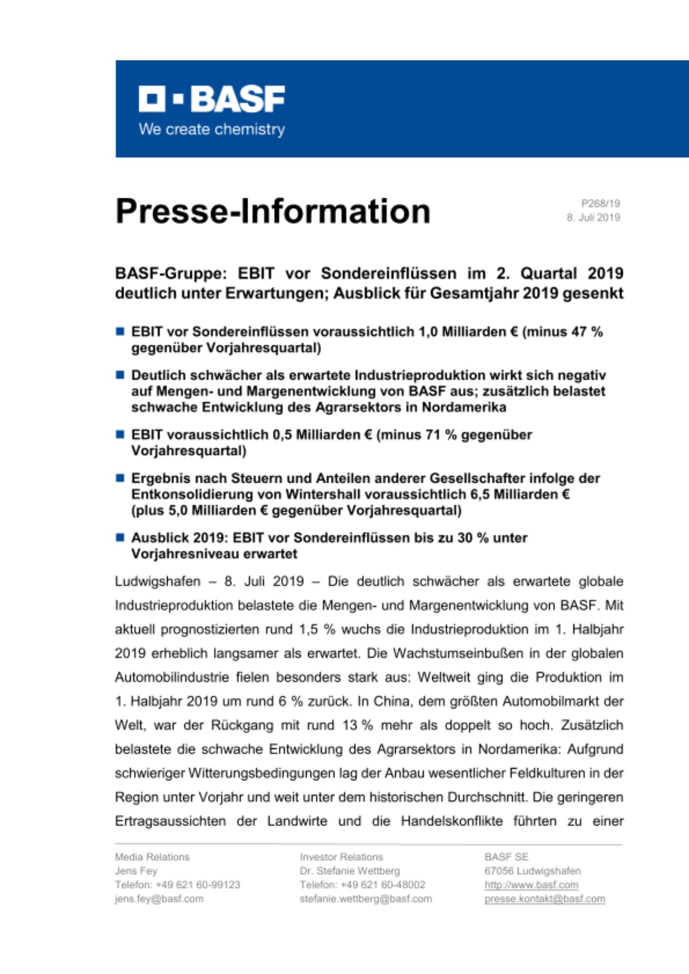 Aufgrund des deutlich schwächer als erwarteten Geschäftsverlaufs im 2. Quartal 2019 sowie einer Verlangsamung des weltwirtschaftlichen Wachstums und der Industrieproduktion, vor allem infolge der Handelskonflikte, geht BASF nunmehr von einem deutlichen Rückgang des EBIT vor Sondereinflüssen von bis zu 30 % unter Vorjahresniveau aus (bisheriger Ausblick: leichter Anstieg des EBIT vor Sondereinflüssen von 1–10 %). BASF erwartet nunmehr einen leichten Rückgang des Umsatzes gegenüber dem Vorjahr (bisheriger Ausblick: leichtes Umsatzwachstum von 1–5 %). Für den Return on Capital Employed (ROCE) rechnet BASF im Gesamtjahr 2019 nunmehr mit einem deutlichen Rückgang im Vergleich zum Vorjahr (bisheriger Ausblick: leichter Rückgang des ROCE von 0,1–1,0 Prozentpunkten gegenüber 2018).