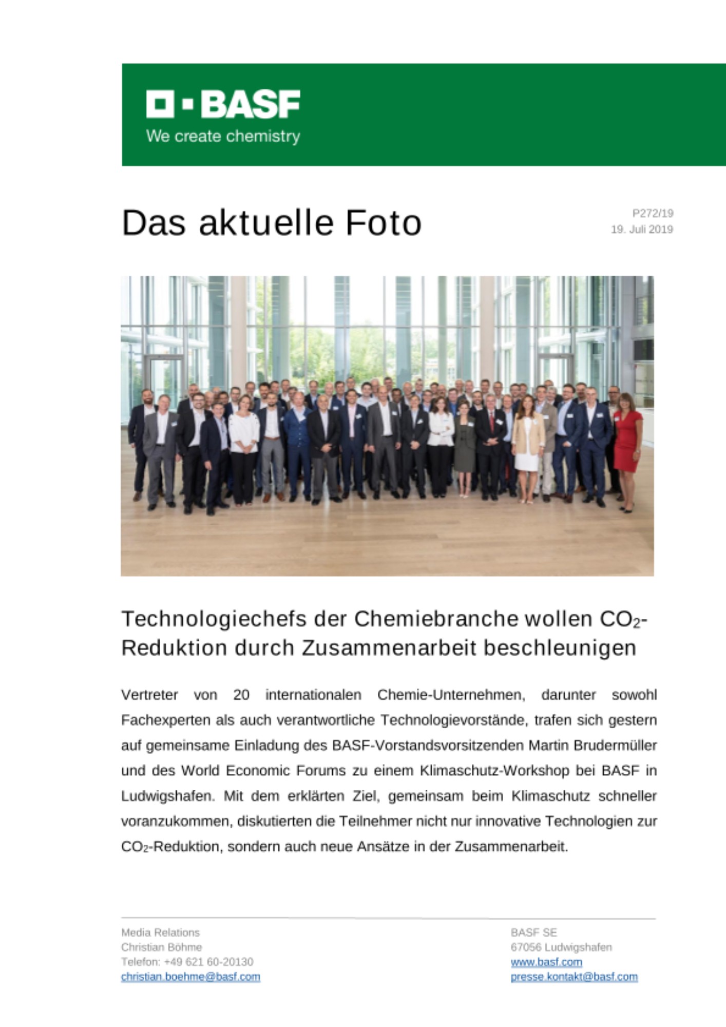 Vertreter von 20 internationalen Chemie-Unternehmen, darunter sowohl Fachexperten als auch verantwortliche Technologievorstände, trafen sich gestern auf gemeinsame Einladung des BASF-Vorstandsvorsitzenden Martin Brudermüller und des World Economic Forums zu einem Klimaschutz-Workshop bei BASF in Ludwigshafen. Mit dem erklärten Ziel, gemeinsam beim Klimaschutz schneller voranzukommen, diskutierten die Teilnehmer nicht nur innovative Technologien zur CO2-Reduktion, sondern auch neue Ansätze in der Zusammenarbeit.
