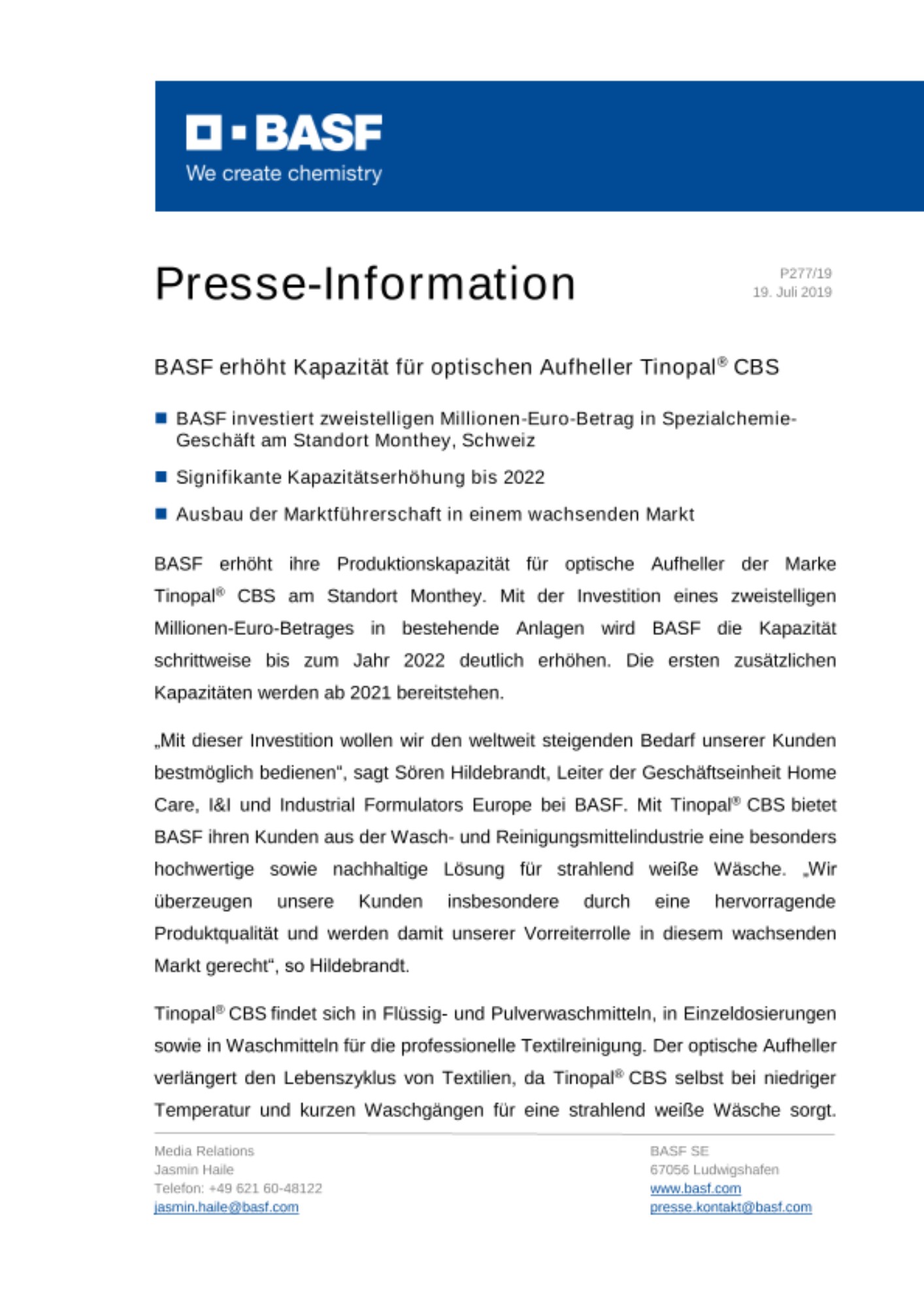 Tinopal® CBS am Standort Monthey. Mit der Investition eines zweistelligen Millionen-Euro-Betrages in bestehende Anlagen wird BASF die Kapazität schrittweise bis zum Jahr 2022 deutlich erhöhen. Die ersten zusätzlichen Kapazitäten werden ab 2021 bereitstehen.