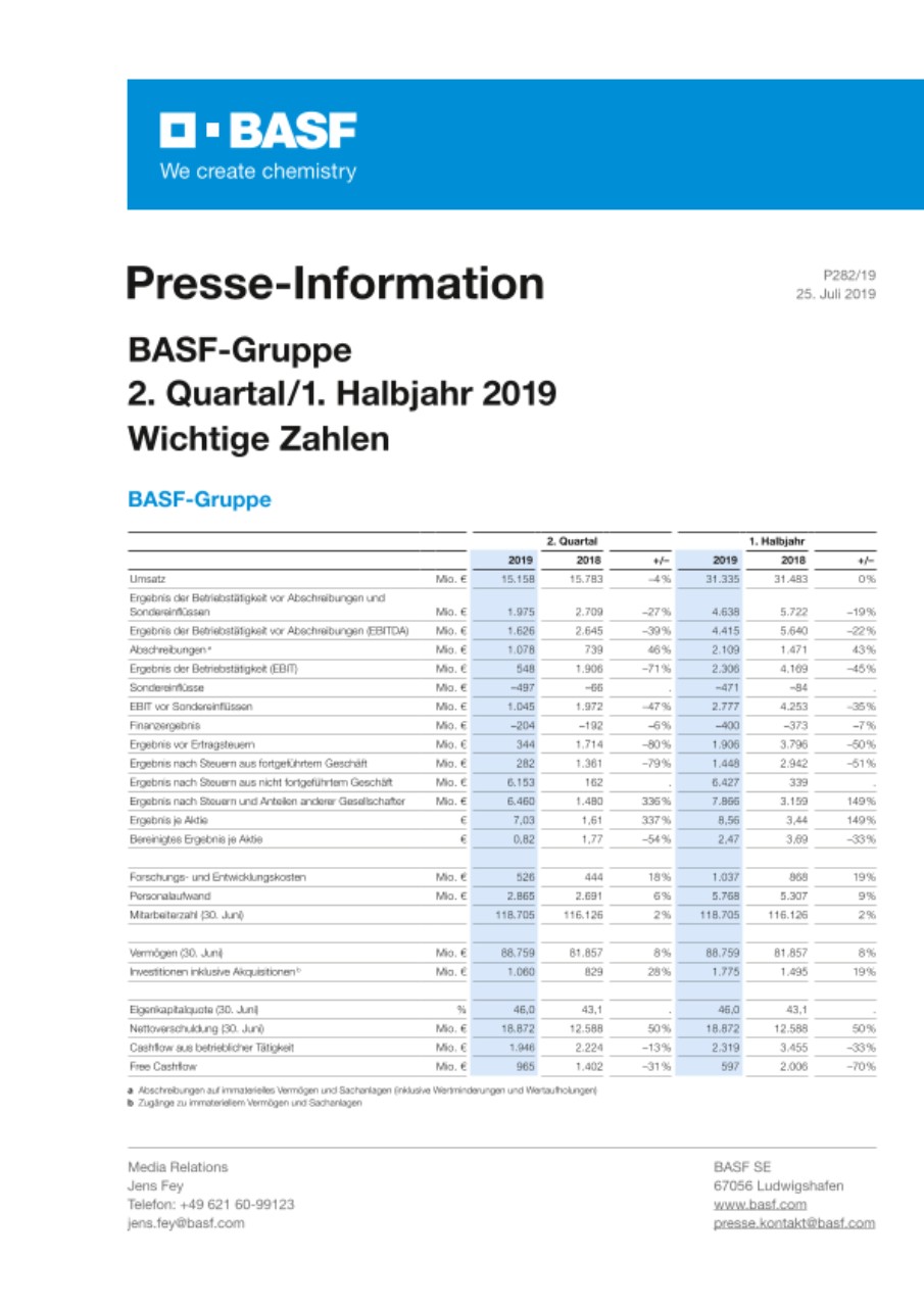Mit Blick auf das herausfordernde makroökonomische Umfeld hatte BASF am 8. Juli den Ausblick der BASF-Gruppe für 2019 angepasst: BASF erwartet nun einen leichten Rückgang beim Umsatz. Für das EBIT vor Sondereinflüssen erwartet das Unternehmen hingegen einen deutlichen Rückgang von bis zu 30 %. Beim Return On Capital Employed (ROCE) wird für das Gesamtjahr 2019 ein deutlicher Rückgang im Vergleich zum Vorjahr erwartet.