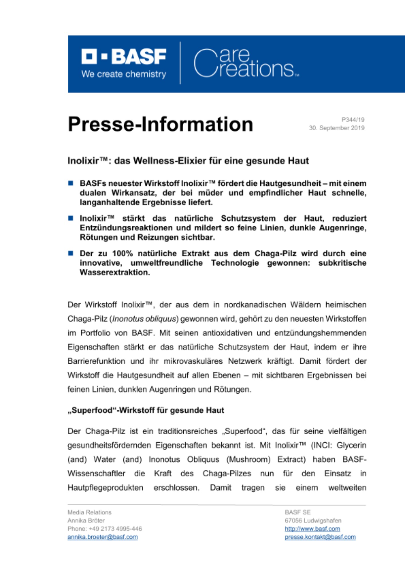 Der Chaga-Pilz ist ein traditionsreiches „Superfood“, das für seine vielfältigen gesundheitsfördernden Eigenschaften bekannt ist. Mit Inolixir™ (INCI: Glycerin (and) Water (and) Inonotus Obliquus (Mushroom) Extract) haben BASF-Wissenschaftler die Kraft des Chaga-Pilzes nun für den Einsatz in Hautpflegeprodukten erschlossen. Damit tragen sie einem weltweiten Verbrauchertrend Rechnung: Die Wahrnehmung von Schönheit verändert sich, ganzheitliche Ansätze werden immer beliebter. Häufig ändern Verbraucher dafür auch ihren Lebensstil und suchen nach Kosmetikprodukten mit natürlichen Inhaltsstoffen.
