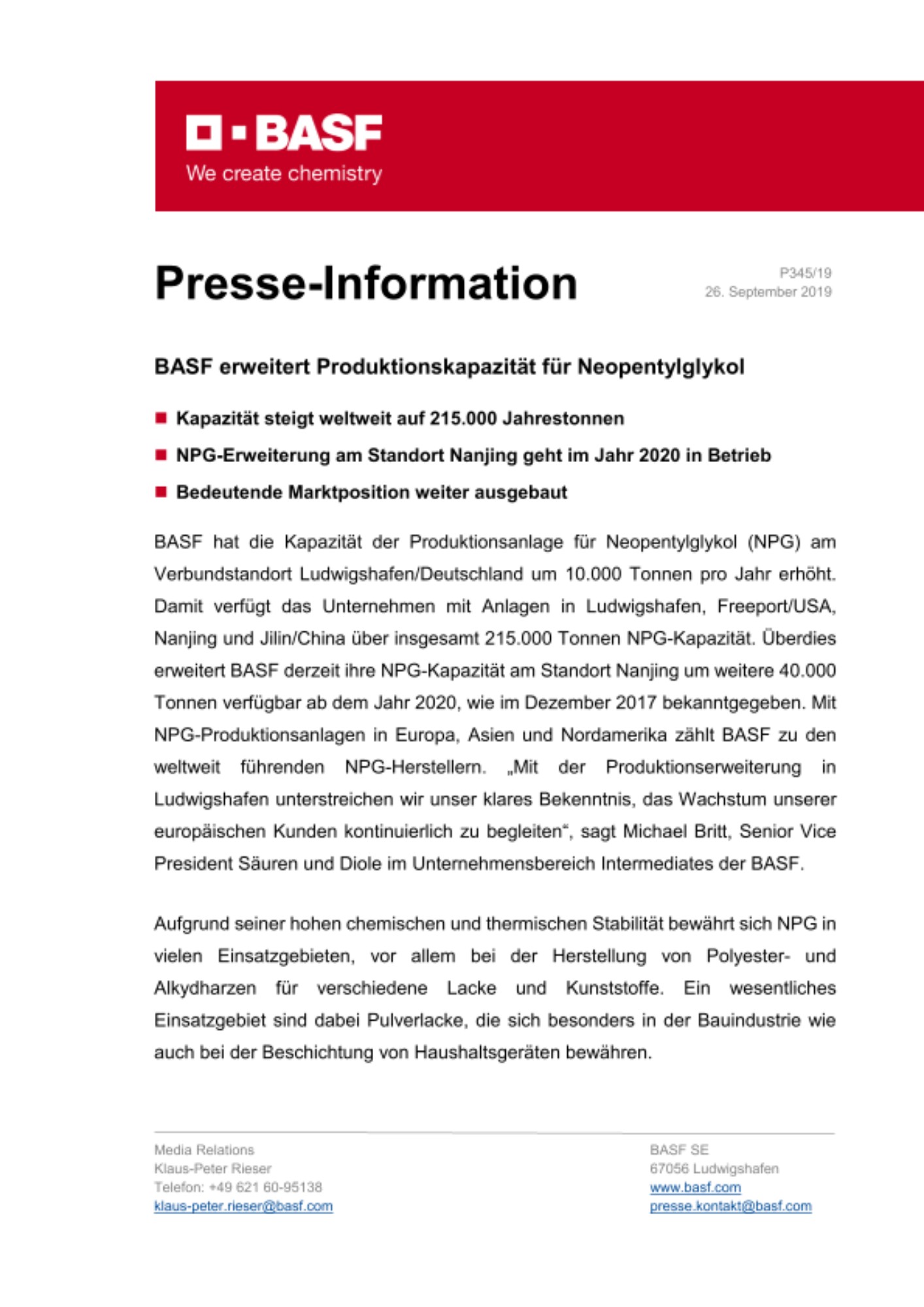 BASF hat die Kapazität der Produktionsanlage für Neopentylglykol (NPG) am Verbundstandort Ludwigshafen/Deutschland um 10.000 Tonnen pro Jahr erhöht. Damit verfügt das Unternehmen mit Anlagen in Ludwigshafen, Freeport/USA, Nanjing und Jilin/China über insgesamt 215.000 Tonnen NPG-Kapazität. Überdies erweitert BASF derzeit ihre NPG-Kapazität am Standort Nanjing um weitere 40.000 Tonnen verfügbar ab dem Jahr 2020, wie im Dezember 2017 bekanntgegeben. Mit NPG-Produktionsanlagen in Europa, Asien und Nordamerika zählt BASF zu den weltweit führenden NPG-Herstellern. „Mit der Produktionserweiterung in Ludwigshafen unterstreichen wir unser klares Bekenntnis, das Wachstum unserer europäischen Kunden kontinuierlich zu begleiten“, sagt Michael Britt, Senior Vice President Säuren und Diole im Unternehmensbereich Intermediates der BASF.