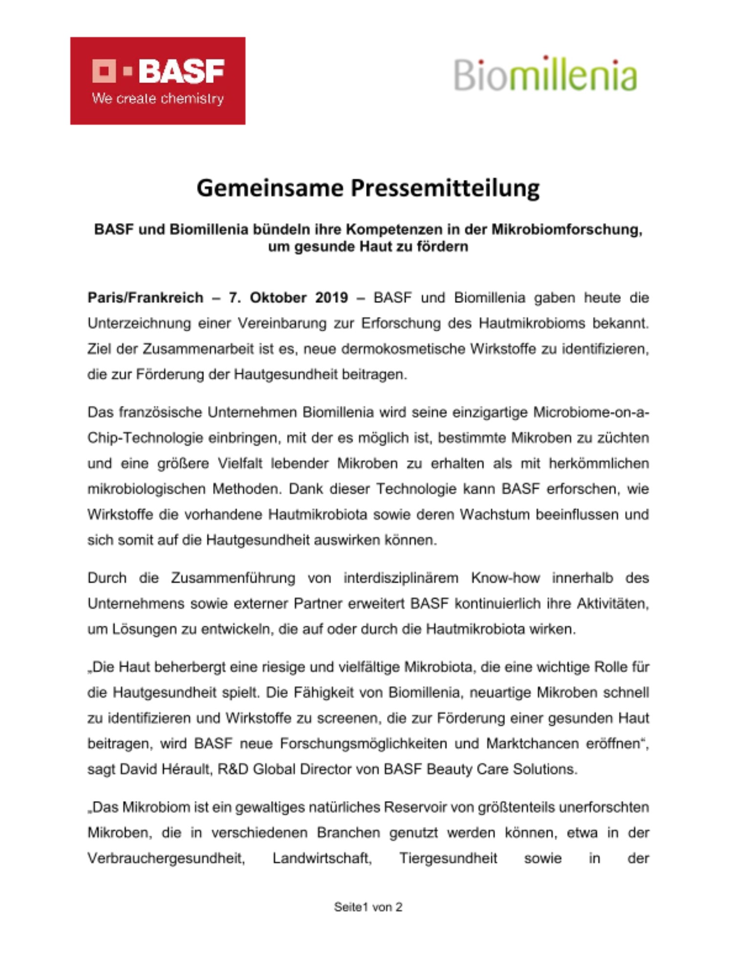 Paris/Frankreich – 7. Oktober 2019 – BASF und Biomillenia gaben heute die Unterzeichnung einer Vereinbarung zur Erforschung des Hautmikrobioms bekannt. Ziel der Zusammenarbeit ist es, neue dermokosmetische Wirkstoffe zu identifizieren, die zur Förderung der Hautgesundheit beitragen.