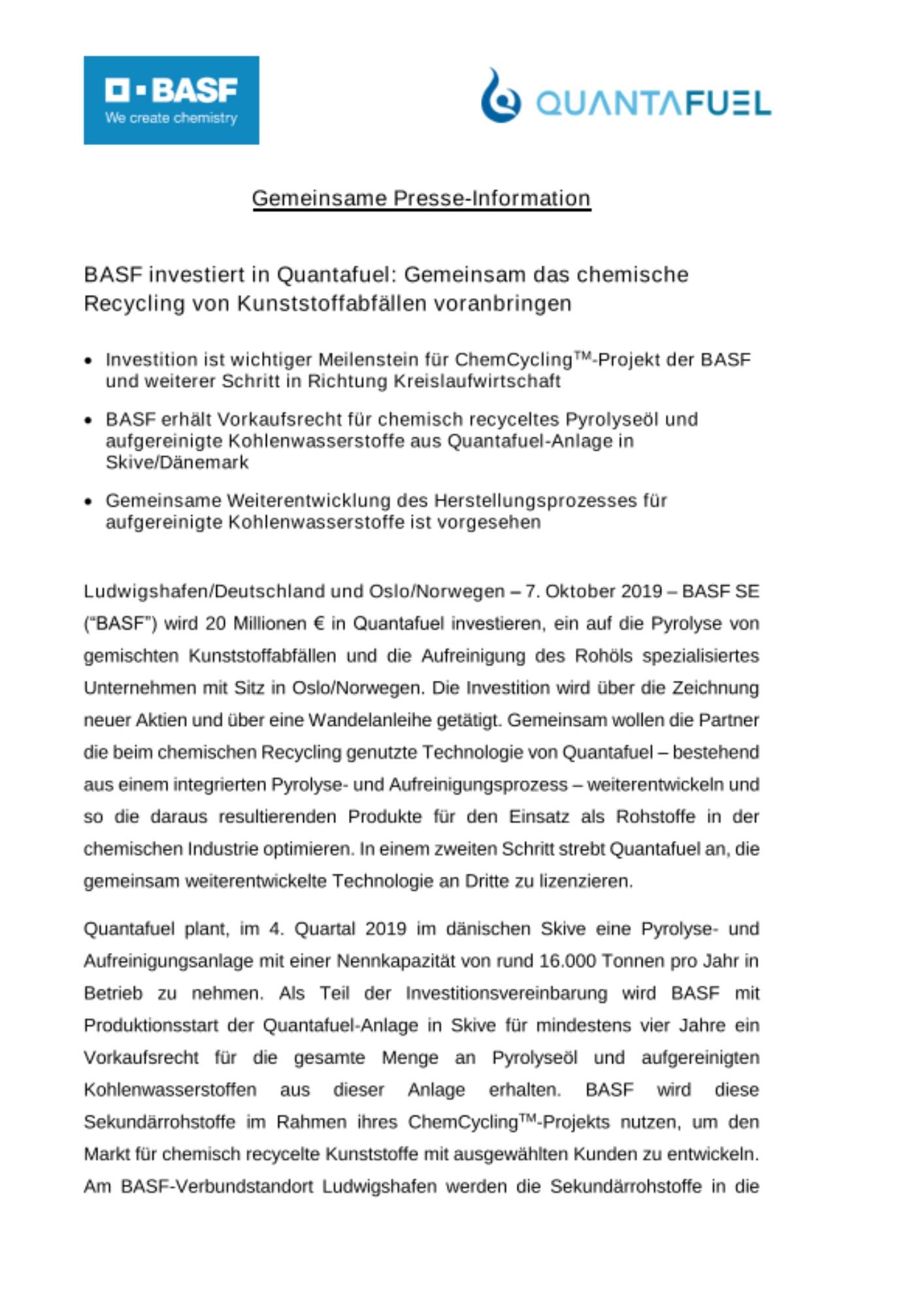 Ludwigshafen/Deutschland und Oslo/Norwegen – 7. Oktober 2019 – BASF SE (“BASF”) wird 20 Millionen € in Quantafuel investieren, ein auf die Pyrolyse von gemischten Kunststoffabfällen und die Aufreinigung des Rohöls spezialisiertes Unternehmen mit Sitz in Oslo/Norwegen. Die Investition wird über die Zeichnung neuer Aktien und über eine Wandelanleihe getätigt. Gemeinsam wollen die Partner die beim chemischen Recycling genutzte Technologie von Quantafuel – bestehend aus einem integrierten Pyrolyse- und Aufreinigungsprozess – weiterentwickeln und so die daraus resultierenden Produkte für den Einsatz als Rohstoffe in der chemischen Industrie optimieren. In einem zweiten Schritt strebt Quantafuel an, die gemeinsam weiterentwickelte Technologie an Dritte zu lizenzieren.