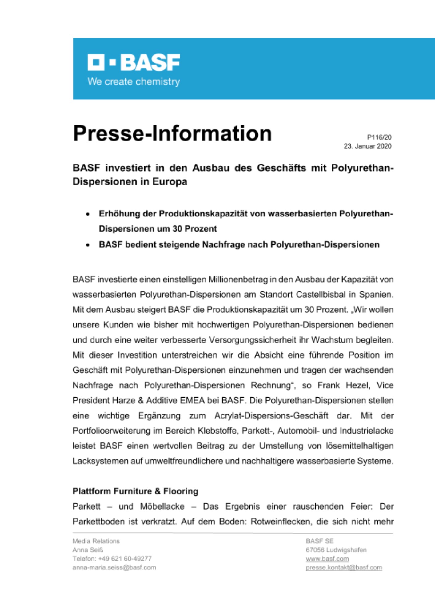 - BASF bedient steigende Nachfrage nach Polyurethan-Dispersionen