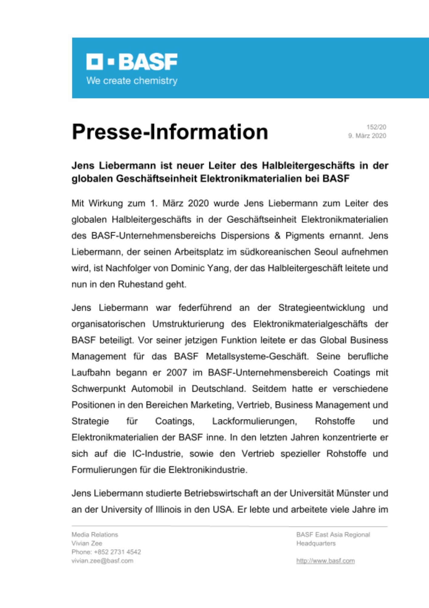 Mit Wirkung zum 1. März 2020 wurde Jens Liebermann zum Leiter des globalen Halbleitergeschäfts in der Geschäftseinheit Elektronikmaterialien des BASF-Unternehmensbereichs Dispersions & Pigments ernannt. Jens Liebermann, der seinen Arbeitsplatz im südkoreanischen Seoul aufnehmen wird, ist Nachfolger von Dominic Yang, der das Halbleitergeschäft leitete und nun in den Ruhestand geht.