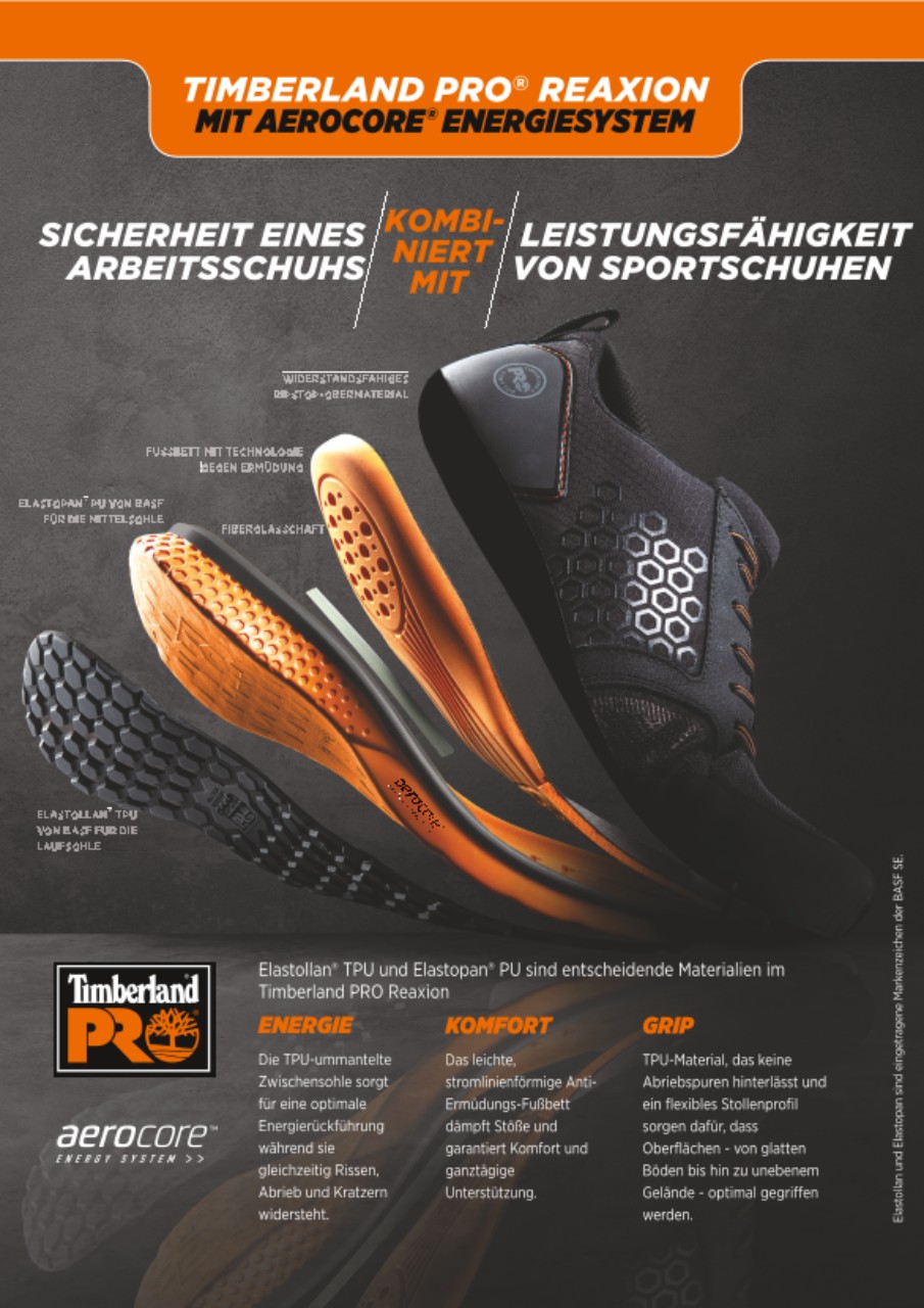 Polyurethan (PU) und thermoplastisches Polyurethan (TPU) der BASF sind Schlüsselkomponenten im neuen Sicherheitsschuh Timberland PRO® Reaxion von Timberland. Der Reaxion-Sicherheitsschuh ist mit dem patentierten Aerocore™ Energy System von Timberland ausgestattet, das den Komfort und die Flexibilität eines Sportschuhs mit der Leistung und Haltbarkeit eines Arbeitsschuhs verbindet.
