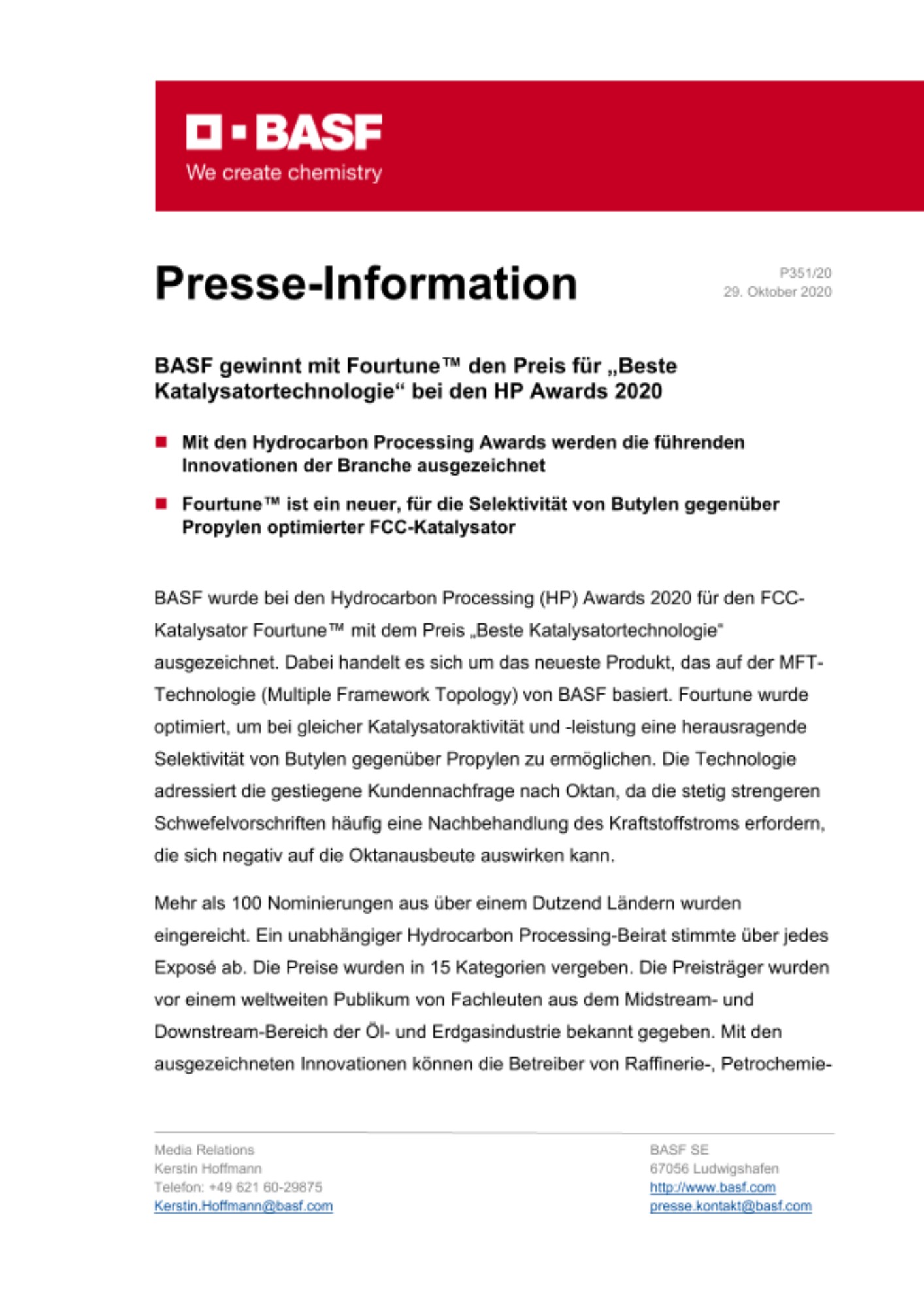 BASF wurde bei den Hydrocarbon Processing (HP) Awards 2020 für den FCC-Katalysator Fourtune™ mit dem Preis „Beste Katalysatortechnologie“ ausgezeichnet. Dabei handelt es sich um das neueste Produkt, das auf der MFT-Technologie (Multiple Framework Topology) von BASF basiert. Fourtune wurde optimiert, um bei gleicher Katalysatoraktivität und -leistung eine herausragende Selektivität von Butylen gegenüber Propylen zu ermöglichen. Die Technologie adressiert die gestiegene Kundennachfrage nach Oktan, da die stetig strengeren Schwefelvorschriften häufig eine Nachbehandlung des Kraftstoffstroms erfordern, die sich negativ auf die Oktanausbeute auswirken kann.