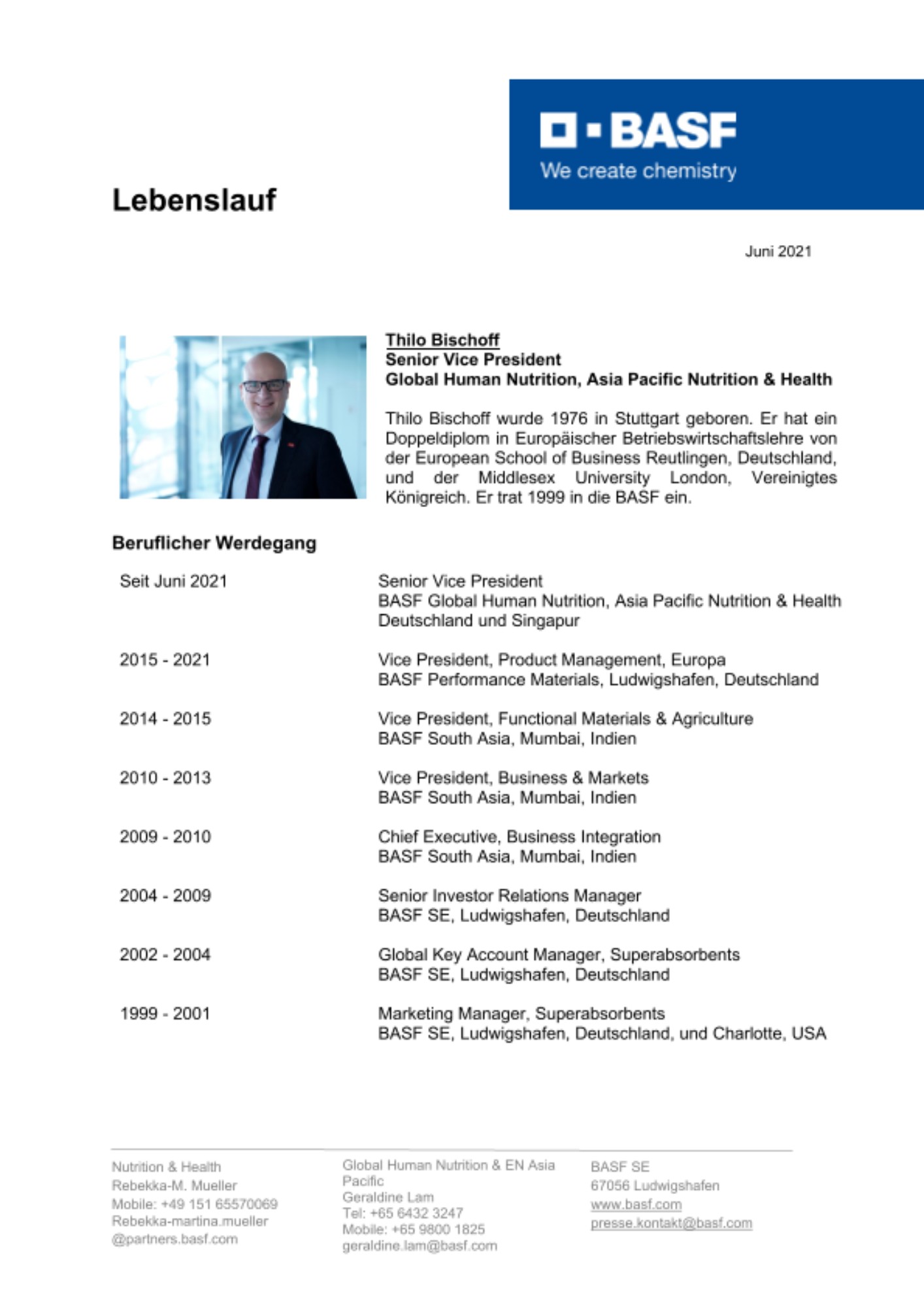 Am 1. Juni wurde Thilo Bischoff zum Senior Vice President Human Nutrition ernannt. Er tritt damit die Nachfolge von François Scheffler an, der die BASF verlassen wird. Bischoff übernimmt die globale Verantwortung für die Geschäftseinheit Human Nutrition und wird zudem den Unternehmensbereich Nutrition & Health in der Region Asien-Pazifik vertreten.