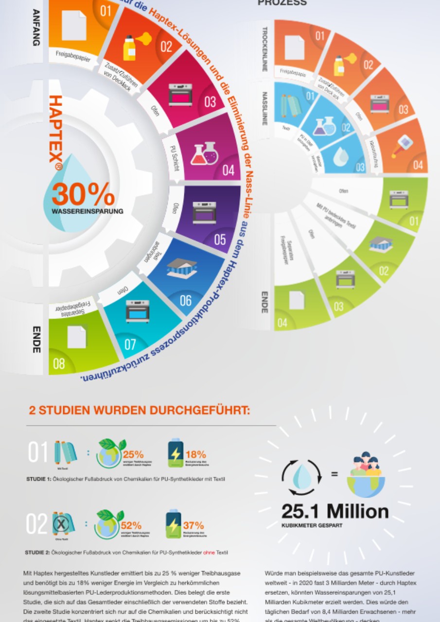 Die LCA-Studie zeigt, dass Haptex im Hinblick auf die Kohlenstoffemissionen besser abschneidet als Kunstleder aus lösungsmittelbasierten und wasserbasierten Verfahren. So wurde beispielsweise nachgewiesen, dass Haptex 52 Prozent weniger Treibhausgasemissionen verursacht als herkömmliches Kunstleder und dass der Energieverbrauch bei einem Einsatz von einem Kilogramm Chemikalien für die Kunstlederherstellung um mehr als 20 Prozent sinkt. Dies ist in erster Linie auf den Wegfall der Nassanlage im Produktionsprozess zurückzuführen, wodurch im Vergleich zu herkömmlichen lösungsmittelbasierten Polyurethan-Produktionsverfahren 30 Prozent weniger Wasser verbraucht wird.