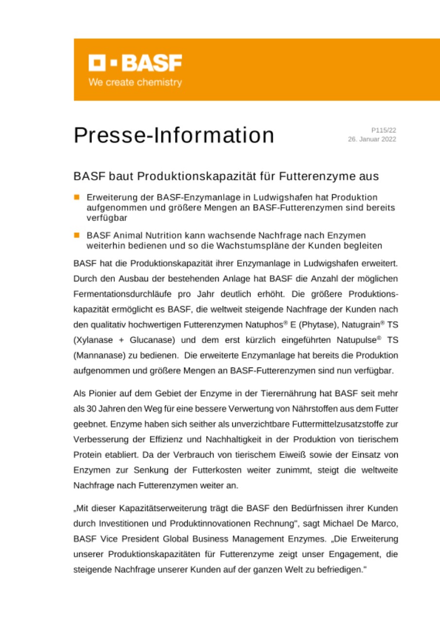 - BASF Animal Nutrition kann wachsende Nachfrage nach Enzymen weiterhin bedienen und so die Wachstumspläne der Kunden begleiten