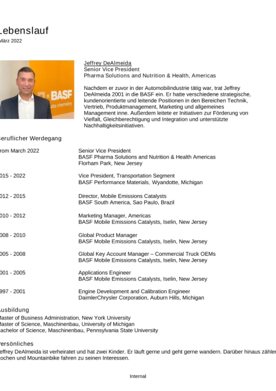 "Ich freue mich, den nächsten Schritt in meiner Karriere bei BASF zu verwirklichen. Es ist mir eine Ehre, das Team von Pharma Solutions und Nutrition & Heath zu unterstützen, insbesondere in einer Zeit, in der wir mit modernsten digitalen Werkzeugen Möglichkeiten für Innovation, operative Exzellenz und außergewöhnliche Kundenerfahrungen im gesamten Unternehmen schaffen. Meine Erfahrung hat mich in einzigartiger Weise darauf vorbereitet, Organisationen in diesem Umfeld zu führen, und ich bin dankbar für die Möglichkeit, Teil dieses unglaublich dynamischen Teams zu sein", sagt Jeffrey DeAlmeida.