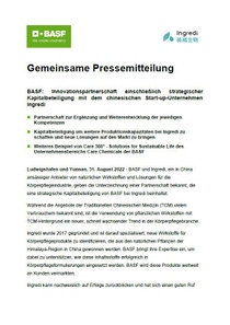 BASF: Innovationspartnerschaft einschließlich strategischer Kapitalbeteiligung mit dem chinesischen Start-up-Unternehmen Ingredi