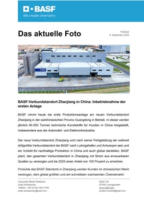 BASF nimmt heute die erste Produktionsanlage am neuen Verbundstandort Zhanjiang in der südchinesischen Provinz Guangdong in Betrieb. In dieser werden jährlich 60.000 Tonnen technische Kunststoffe für Kunden in China hergestellt, insbesondere aus der Automobil- und Elektronikindustrie.