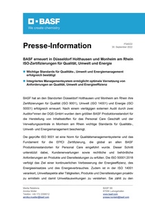 BASF erneuert in Düsseldorf Holthausen und Monheim am Rhein ISO-Zertifizierungen für Qualität, Umwelt und Energie