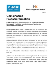 Hongkong, China; Seoul, Korea - 6. Oktober 2022 - Nach der Genehmigung aller zuständigen Behörden planen BASF und Hannong Chemicals die Gründung eines Produktions-Joint Ventures „BASF Hannong Chemicals Solutions Co., Ltd.". Die neue Gesellschaft wird mehrheitlich im Besitz von BASF sein (BASF 51%; Hannong Chemicals 49%).