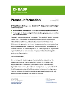 Elastollan®, das thermoplastische Polyurethan (TPU) der BASF, kommt durch den Fertiger duro3D als Filament bei der Herstellung individueller Schuheinlagen mittels 3D-Druckverfahren zum Einsatz. Das Material zeichnet sich in der Sohlenanwendung vor allem durch seine ausgezeichnete Schwingungsdämpfung und Rückstellfähigkeit aus. Unter starker Beanspruchung z.B. bei Verwendung in Sportschuhen ist es die Abriebfestigkeit, die die Sohle langlebig und angenehm zu tragen macht. Auch bei schwankenden Temperaturen behält die Einlage ihre gewünschten Eigenschaften.