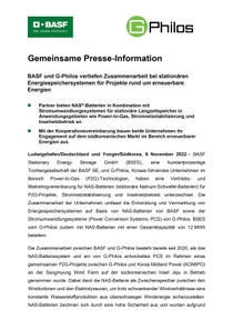 BASF und G-Philos vertiefen Zusammenarbeit bei stationären Energiespeichersystemen für Projekte rund um erneuerbare Energien