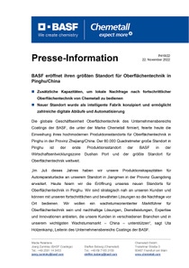 Die globale Geschäftseinheit Oberflächentechnik des Unternehmensbereichs Coatings der BASF, die unter der Marke Chemetall firmiert, feierte heute die Einweihung ihres hochmodernen Produktionsstandorts für Oberflächentechnik in Pinghu in der Provinz Zhejiang/China. Der 60.000 Quadratmeter große Standort in Pinghu ist der erste Produktionsstandort der BASF in der Wirtschaftsentwicklungszone Dushan Port und der größte Standort für Oberflächentechnik weltweit.