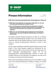 - BASF kann eine breite Palette biomassenbilanzierter Automobillacke anbieten und so die unterschiedlichen Anforderungen von Kunden in China erfüllen