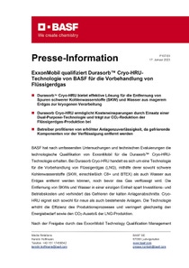 ExxonMobil qualifiziert Durasorb™ Cryo-HRU-Technologie von BASF für die Vorbehandlung von Flüssigerdgas