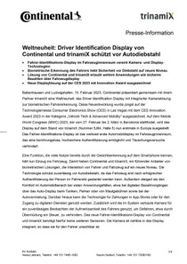 Babenhausen und Ludwigshafen, 15. Februar 2023. Continental präsentiert gemeinsam mit ihrem Partner trinamiX eine Weltneuheit: das Driver Identification Display mit integrierter Kameralösung zur biometrischen Fahrererkennung. Diese Neuentwicklung wurde jüngst auf der Technologiemesse Consumer Electronics Show (CES) in Las Vegas mit dem CES Innovation Award 2023 in der Kategorie „Vehicle Tech & Advanced Mobility“ ausgezeichnet. Auf dem Mobile World Congress (MWC) 2023, der vom 27. Februar bis 2. März in Barcelona stattfindet, wird das Display auf dem Stand von trinamiX (Nummer 5J84, Halle 5) nun erstmals in Europa ausgestellt. Das Fahrer-Identifikations-Display ist das weltweit erste Automobildisplay im Fahrzeuginnenraum, das eine berührungslose, hochsichere Authentifizierung ermöglicht und gegen Täuschungen und Diebstahl schützt.