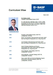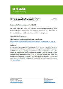 Dr. Ketan Joshi (44), Senior Vice President, Petrochemicals Asia Pacific, BASF East Asia Regional Headquarters Ltd., Hongkong, übernimmt am 1. März 2023 als President die Leitung des Bereichs Intermediates in Ludwigshafen.