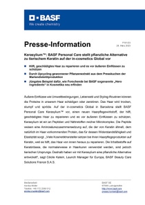 Personal Care Kerasylium™ vor, einen neuen Haarpflegewirkstoff, der hilft, geschädigtes Haar zu reparieren und es vor äußeren Einflüssen zu schützen. Kerasylium ist ein an Peptiden und Nährstoffen reicher Mikrokomplex. Die Peptide weisen eine Aminosäurezusammensetzung auf, die der von Keratin ähnelt, dem natürlich im Haar vorkommenden Protein, das für dessen Widerstandsfähigkeit und Elastizität sorgt. „Viele Kosmetikhersteller setzen bei ihren Haarpflegeprodukten auf Keratin, weil es hilft, das Haar von innen heraus zu reparieren. Die Inhaltsstoffe auf Keratinbasis, die normalerweise in Haarkuren verwendet werden, sind jedoch tierischen Ursprungs. Deshalb haben wir mit Kerasylium eine pflanzliche Alternative entwickelt“, sagt Cécile Kalem, Launch Manager für Europa, BASF Beauty Care Solutions France S.A.S.