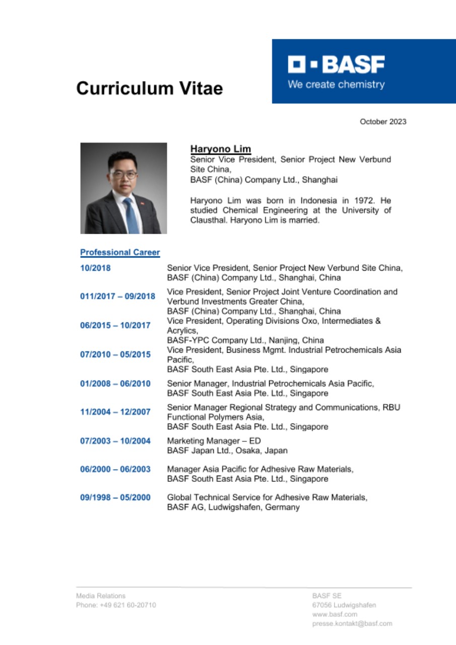 Haryono Lim (50), derzeit Senior Vice President, Senior Project New Verbund Site China, BASF (China) Company Ltd., Shanghai, wird Klaus Welsch ab dem 1. Januar 2024 als President mit Sitz in Zhanjiang nachfolgen.