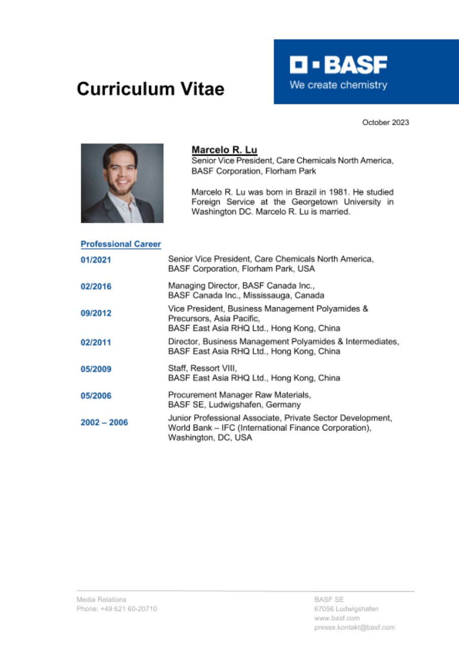 Marcelo R. Lu (42), Senior Vice President, Care Chemicals North America, BASF Corporation, Florham Park, wird ab 1. Februar 2024 als President die Verantwortung für den Bereich South & East Asia, ASEAN & ANZ, BASF South East Asia Pte. Ltd., mit Sitz in Singapur übernehmen. Die derzeitige Leiterin des Bereichs, Carola Richter (50), hat beschlossen, das Unternehmen zu verlassen.