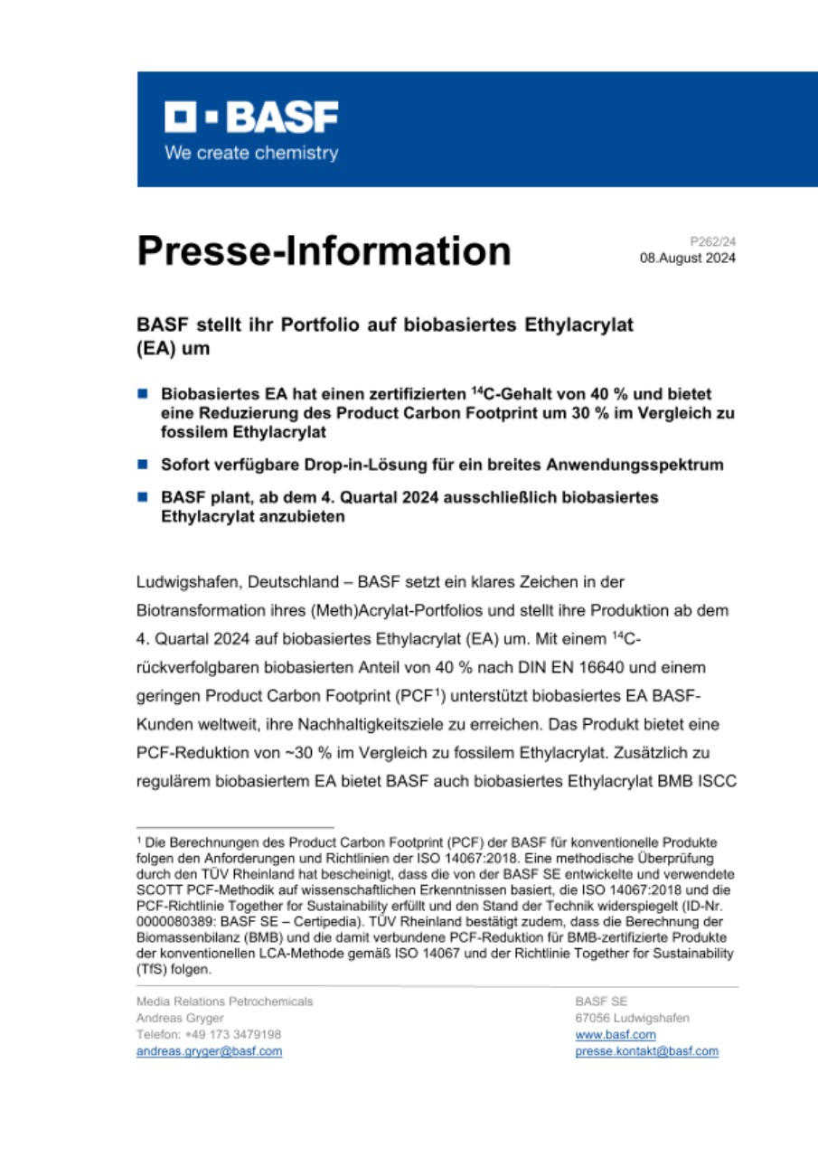 - BASF plant, ab dem 4. Quartal 2024 ausschließlich biobasiertes Ethylacrylat anzubieten