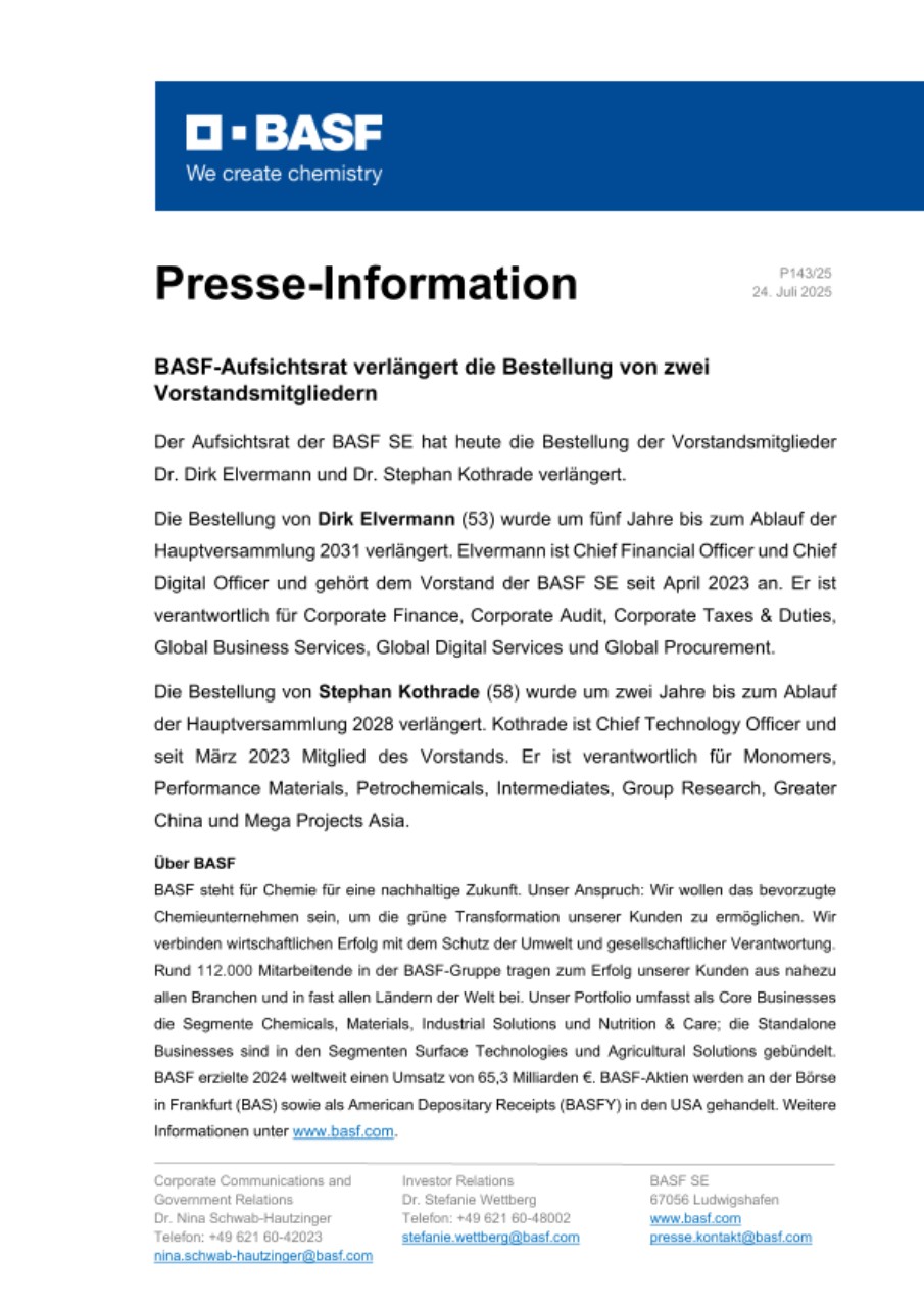 Der Aufsichtsrat der BASF SE hat heute die Bestellung der Vorstandsmitglieder Dr. Dirk Elvermann und Dr. Stephan Kothrade verlängert.