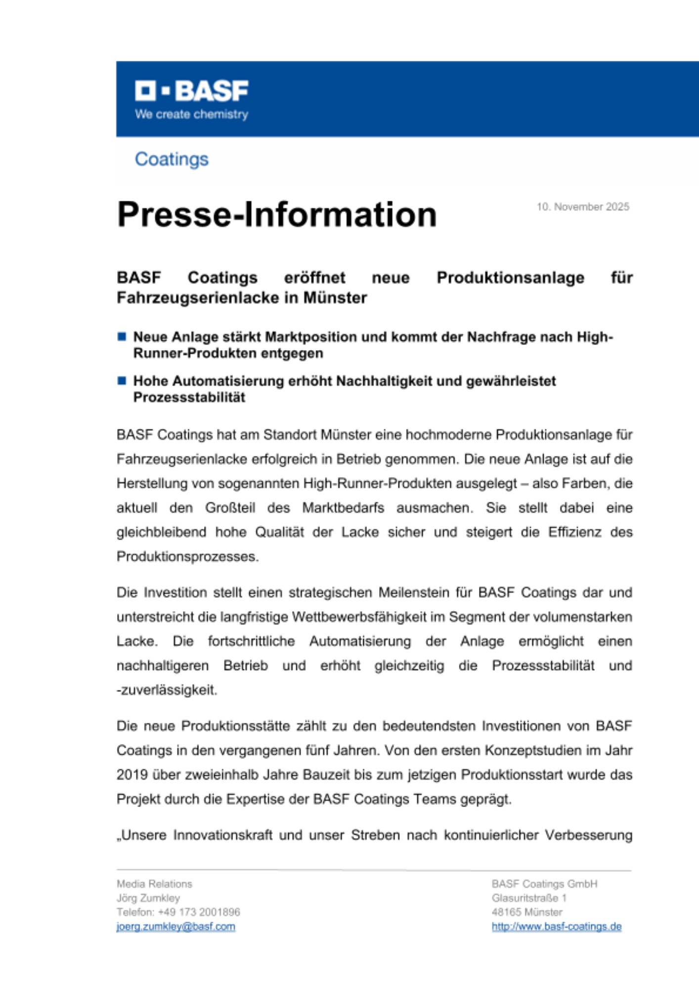 Die Investition stellt einen strategischen Meilenstein für BASF Coatings dar und unterstreicht die langfristige Wettbewerbsfähigkeit im Segment der volumenstarken Lacke. Die fortschrittliche Automatisierung der Anlage ermöglicht einen nachhaltigeren Betrieb und erhöht gleichzeitig die Prozessstabilität und -zuverlässigkeit.