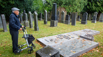Albrecht Weinberg am Grab seiner Familie auf dem jüdischen Friedhof in Leer (Ostfriesland), 2023