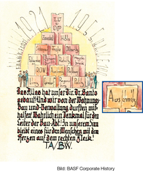 In den ersten Nachkriegsjahrzehnten offenbart der Blick zurück auf die I.G. Farben-Zeit ein zweigeteiltes Erinnern: Zwar werden wissenschaftlich-technische Erfolge als Teil der Geschichte der 1952 neugegründeten BASF beansprucht. Die damit in Verbindung stehenden politisch-gesellschaftlichen Umstände oder gar Verbrechen werden allerdings ausgeblendet. Das zeigt beispielhaft die handgemalte Glückwunschkarte zu Camil Santos Pensionierung 1955, der seit 1932 die Ludwigshafener Bau-Abteilung leitet und noch als Ruheständler bis 1957 die Fertigstellung des BASF-Hochhauses betreut. In der stolz präsentierten Reihe der vielen Standorte, deren Auf- oder Ausbau Santo betreut hat, findet sich auf der Glückwunschkarte auch ohne weiteren Kommentar: Auschwitz (in der nebenstehenden Abbildung zur Veranschaulichung hervorgehoben).