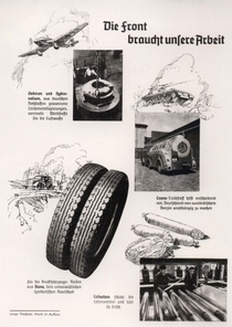 I.G. Farben-Produkte für den Krieg, darunter Leuna-Benzin und Reifen aus Buna (Auszug aus der Werkzeitung, Dezember 1939)