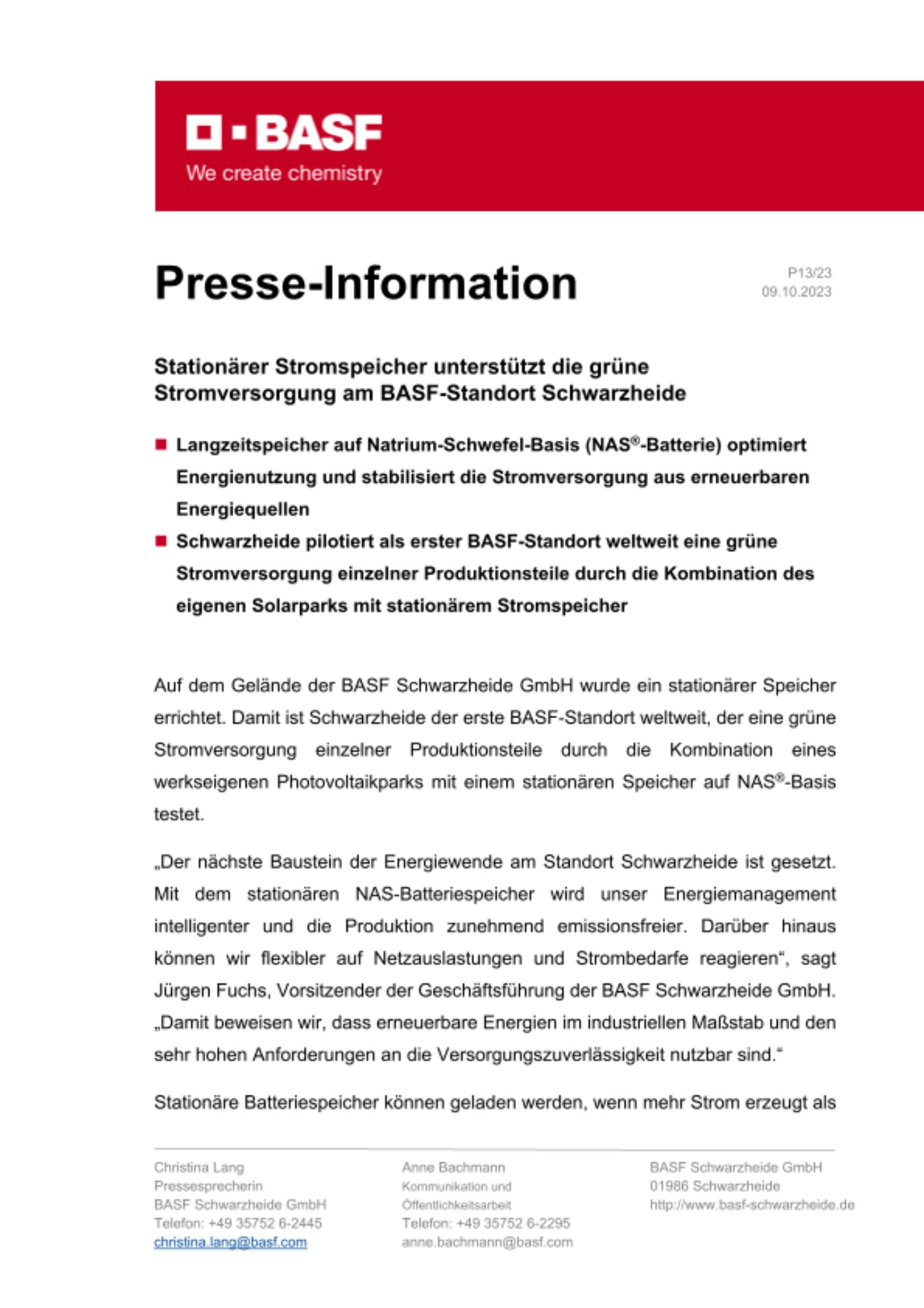 - Schwarzheide pilotiert als erster BASF-Standort weltweit eine grüne Stromversorgung einzelner Produktionsteile durch die Kombination des eigenen Solarparks mit stationärem Stromspeicher