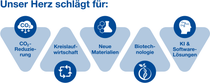 Wir investieren und arbeiten in Bereichen zusammen, die die Zukunft prägen: CO2-Reduzierung, Kreislaufwirtschaft, neue Materialien, Biotechnologie sowie künstliche Intelligenz und Softwarelösungen.