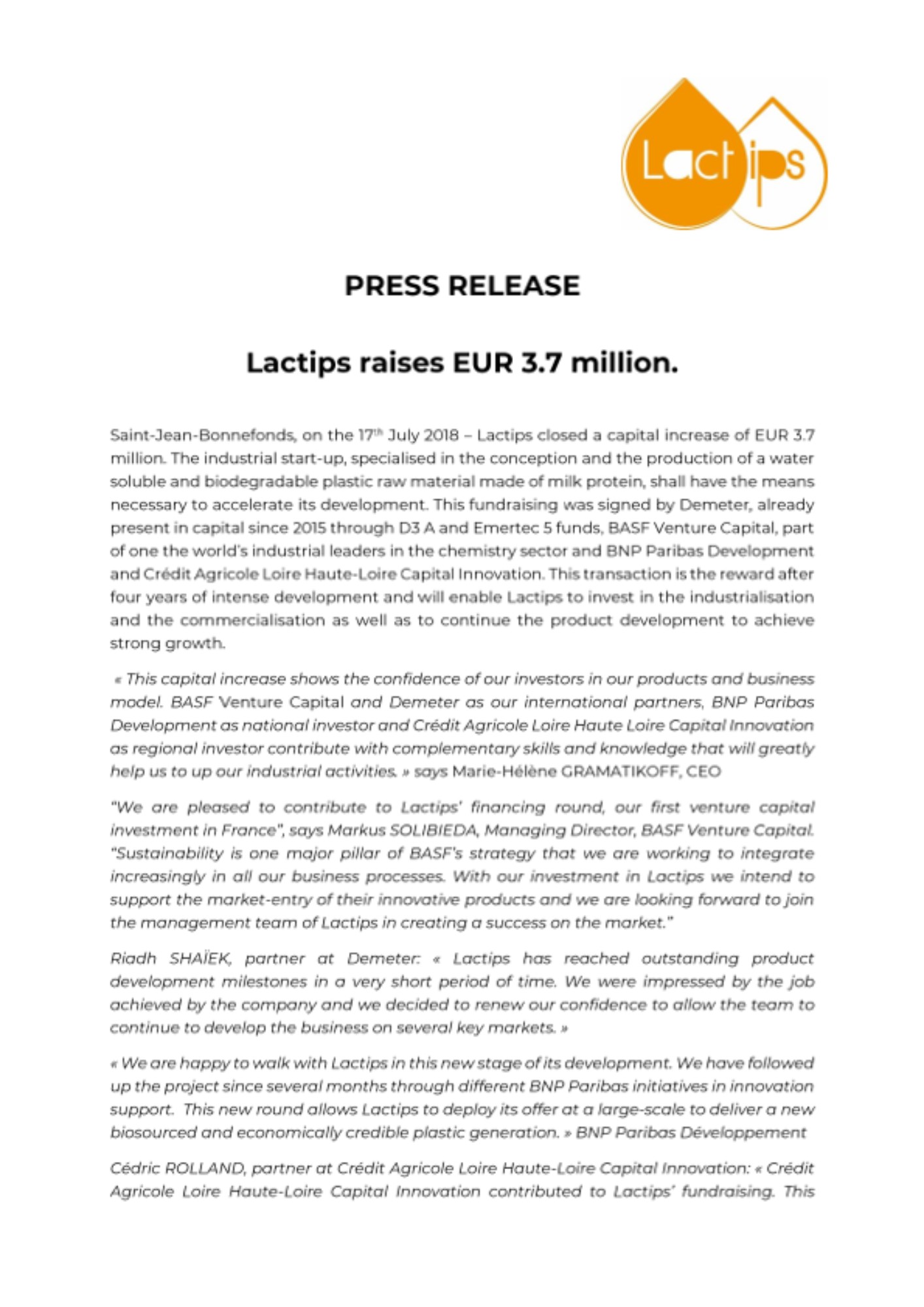 Saint-Jean-Bonnefonds, on the 17th July 2018 - Lactips closed a capital increase of EUR 3.7 million. The industrial start-up, specialised in the conception and the production of a water soluble and biodegradable plastic raw material made of milk protein, shall have the means necessary to accelerate its development. This fundraising was signed by Demeter, already present in capital since 2015 through D3 A and Emertec 5 funds, BASF Venture Capital, part of one the world's industrial leaders in the chemistry sector and BNP Paribas Development and Crédit Agricole Loire Haute-Loire Capital Innovation. This transaction is the reward after four years of intense development and will enable Lactips to invest in the industrialisation and the commercialisation as well as to continue the product development to achieve strong growth.