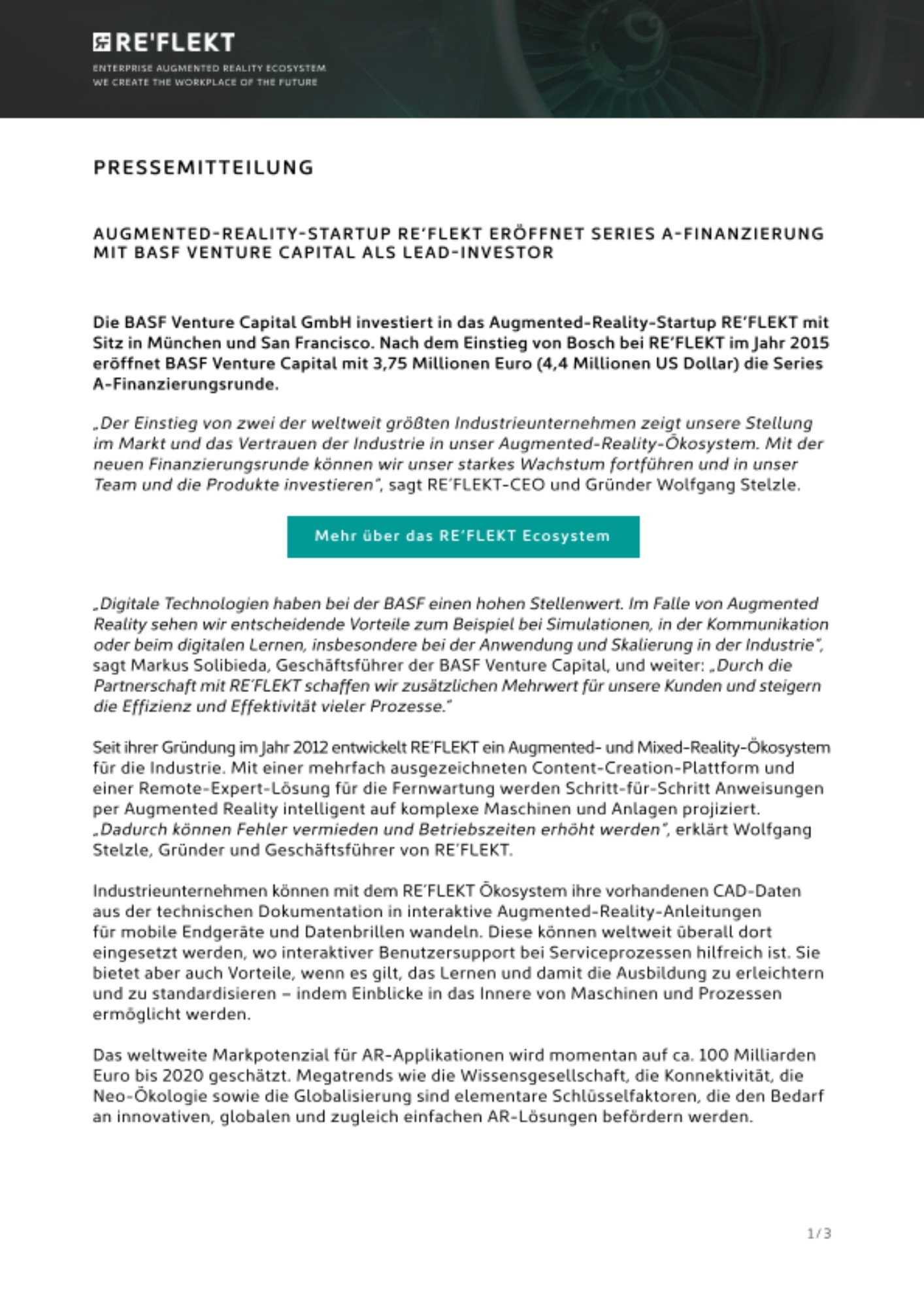 Die BASF Venture Capital GmbH investiert in das Augmented-Reality-Startup RE’FLEKT mit Sitz in München und San Francisco. Nach dem Einstieg von Bosch bei RE’FLEKT im Jahr 2015 eröffnet BASF Venture Capital mit 3,75 Millionen Euro (4,4 Millionen US Dollar) die Series A-Finanzierungsrunde.