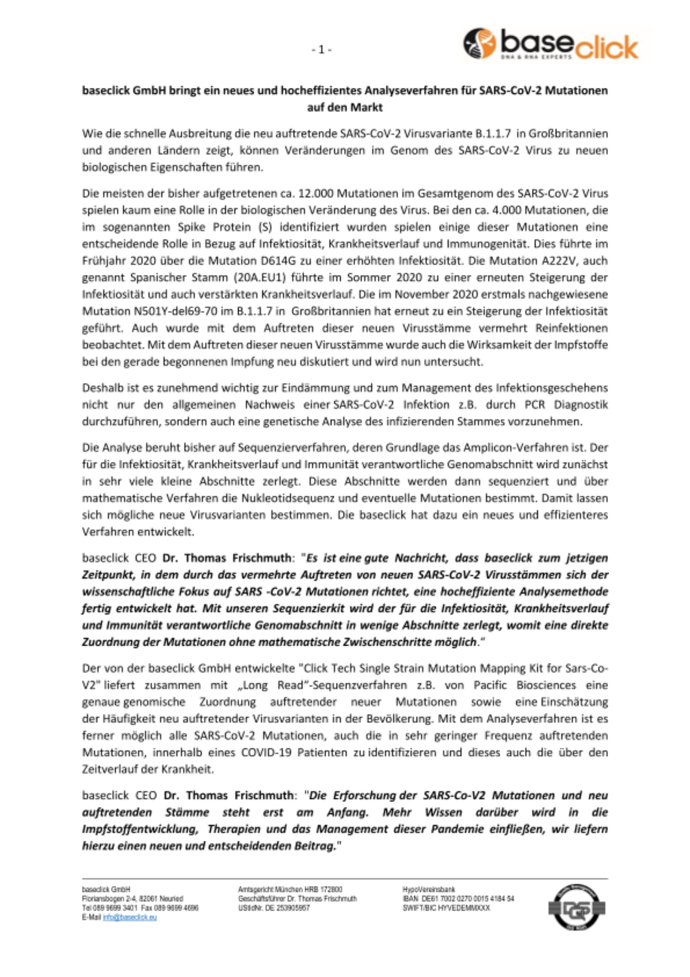 baseclick CEO Dr. Thomas Frischmuth: "Es ist eine gute Nachricht, dass baseclick zum jetzigen Zeitpunkt, in dem durch das vermehrte Auftreten von neuen SARS-CoV-2 Virusstämmen sich der wissenschaftliche Fokus auf SARS -CoV-2 Mutationen richtet, eine hocheffiziente Analysemethode fertig entwickelt hat. Mit unseren Sequenzierkit wird der für die Infektiosität, Krankheitsverlauf und Immunität verantwortliche Genomabschnitt in wenige Abschnitte zerlegt, womit eine direkte Zuordnung der Mutationen ohne mathematische Zwischenschritte möglich.“