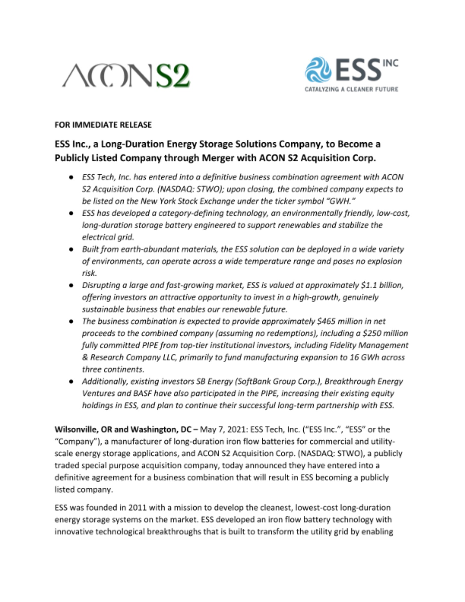 Wilsonville, OR and Washington, D.C. – May 7, 2021: ESS Tech, Inc. (“ESS, Inc.”, “ESS” or the “Company”), a manufacturer of long-duration iron flow batteries for commercial and utility-scale energy storage applications, and ACON S2 Acquisition Corp. (NASDAQ: STWO), a publicly traded special purpose acquisition company, today announced they have entered into a definitive agreement for a business combination that will result in ESS becoming a publicly listed company.