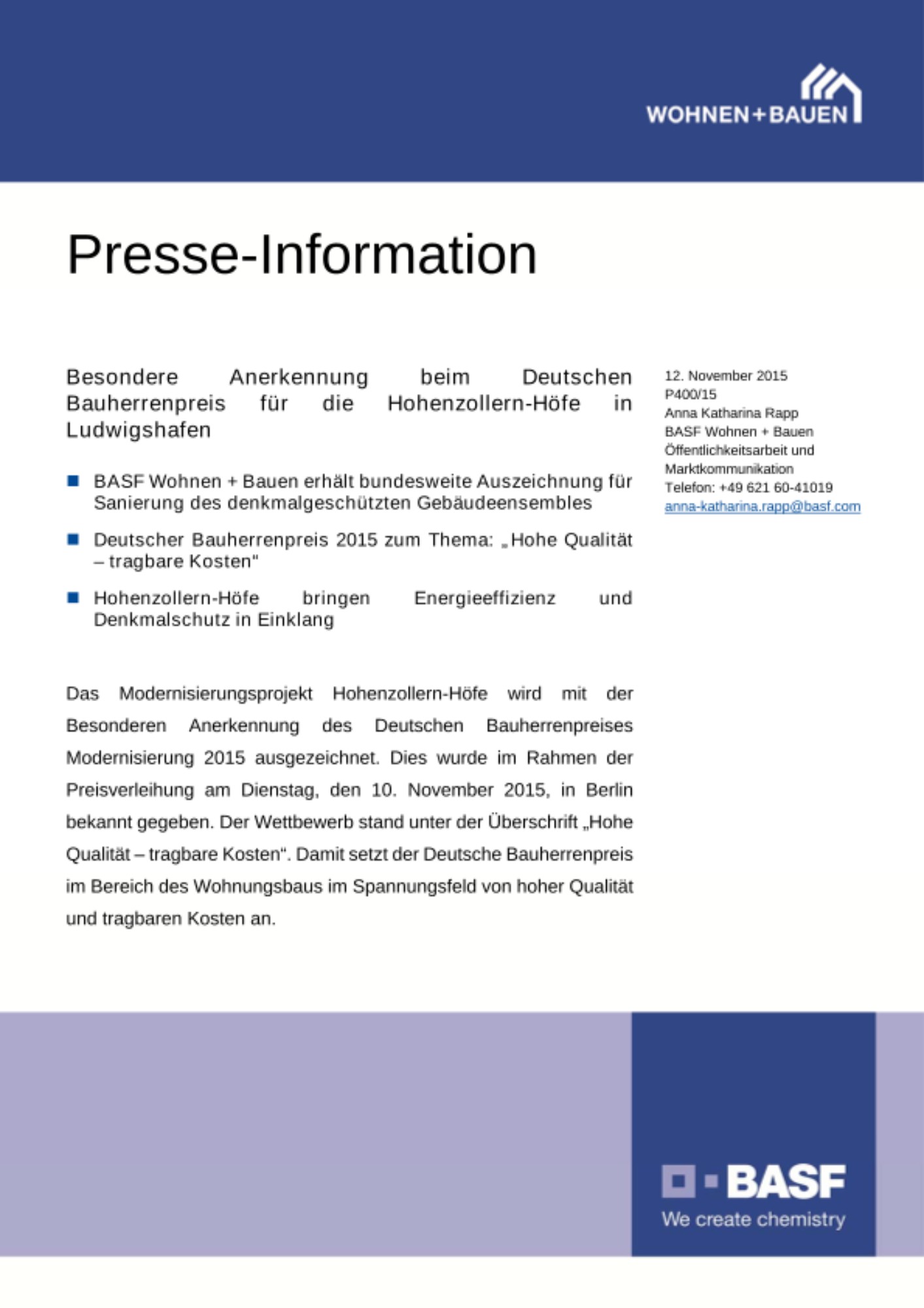 Das Modernisierungsprojekt Hohenzollern-Höfe wird mit der Besonderen Anerkennung des Deutschen Bauherrenpreises Modernisierung 2015 ausgezeichnet. Dies wurde im Rahmen der Preisverleihung am Dienstag, den 10. November 2015, in Berlin bekannt gegeben. Der Wettbewerb stand unter der Überschrift „Hohe Qualität – tragbare Kosten“. Damit setzt der Deutsche Bauherrenpreis im Bereich des Wohnungsbaus im Spannungsfeld von hoher Qualität und tragbaren Kosten an.