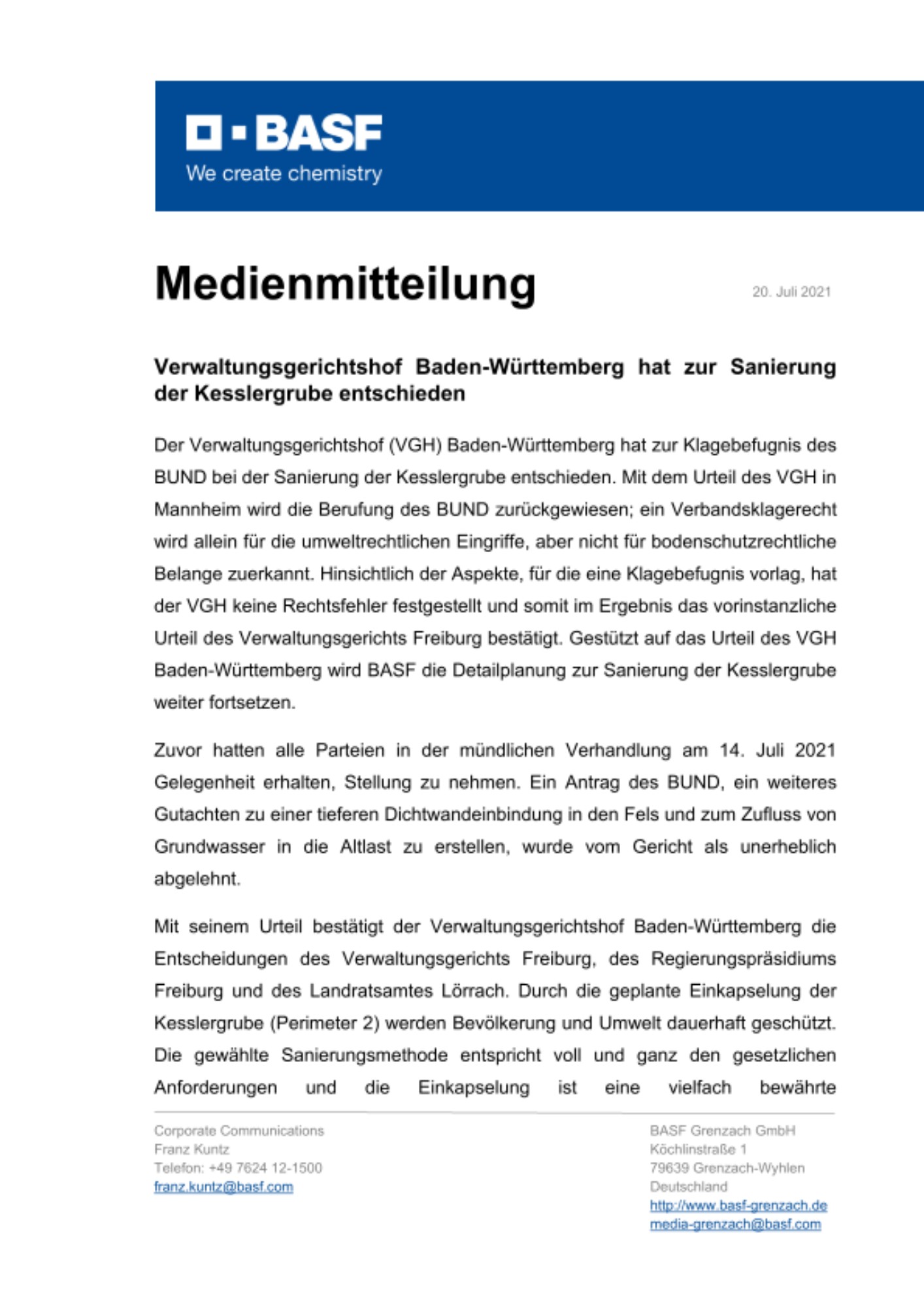 Der Verwaltungsgerichtshof (VGH) Baden-Württemberg hat zur Klagebefugnis des BUND bei der Sanierung der Kesslergrube entschieden. Mit dem Urteil des VGH in Mannheim wird die Berufung des BUND zurückgewiesen; ein Verbandsklagerecht wird allein für die umweltrechtlichen Eingriffe, aber nicht für bodenschutzrechtliche Belange zuerkannt. Hinsichtlich der Aspekte, für die eine Klagebefugnis vorlag, hat der VGH keine Rechtsfehler festgestellt und somit im Ergebnis das vorinstanzliche Urteil des Verwaltungsgerichts Freiburg bestätigt. Gestützt auf das Urteil des VGH Baden-Württemberg wird BASF die Detailplanung zur Sanierung der Kesslergrube weiter fortsetzen.